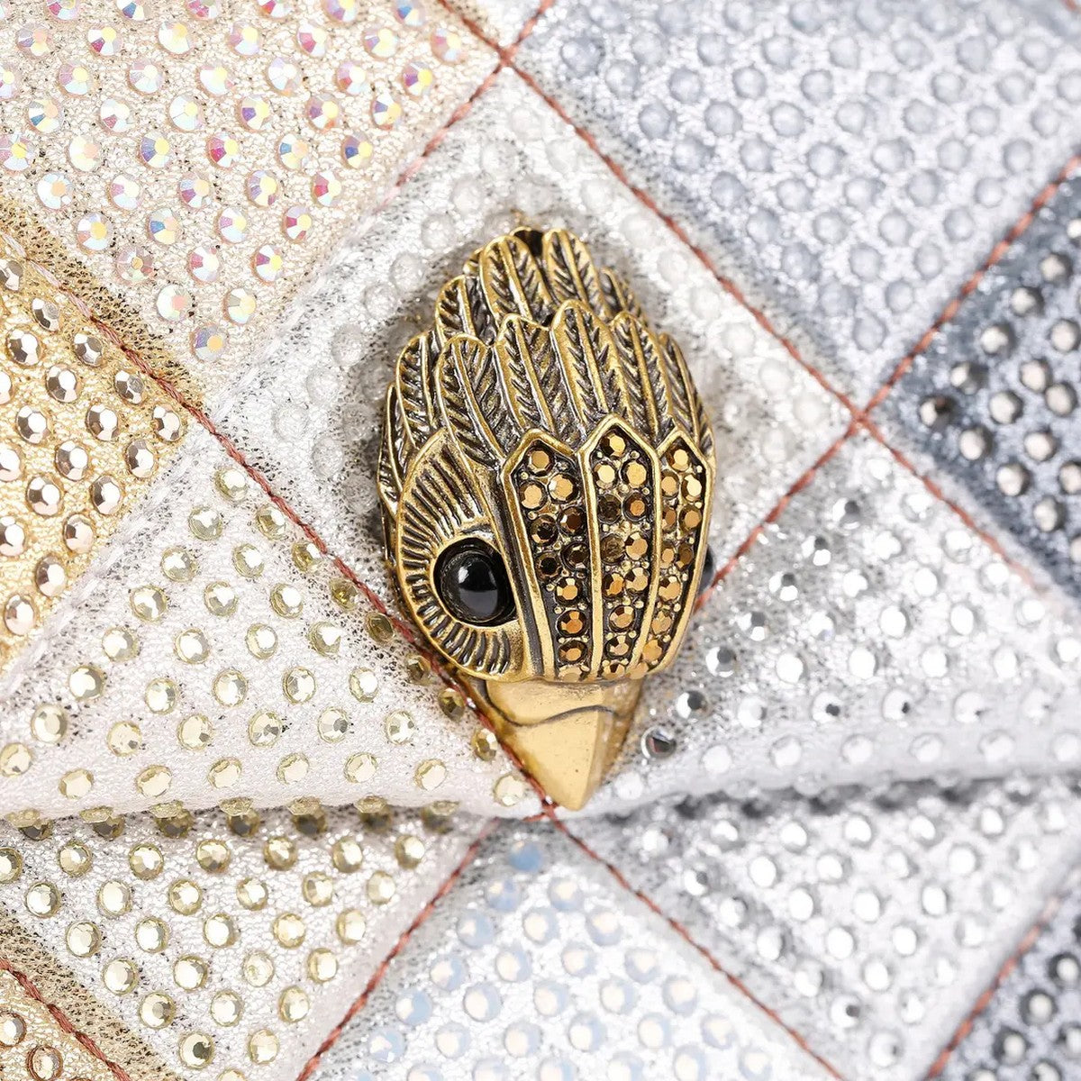 Borsa Kensington Media KURT GEIGER con paillettes, realizzata in un design a rombi color terra tenue, impreziosito da cristalli. La patta frontale è impreziosita da una testa d'aquila in ottone anticato.