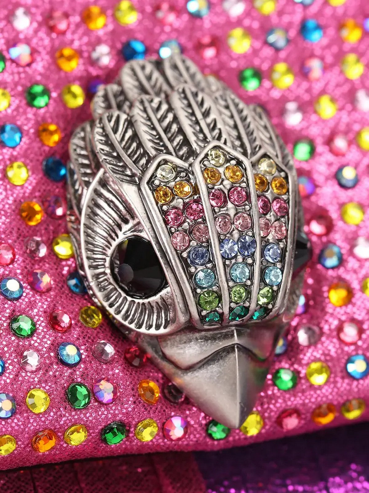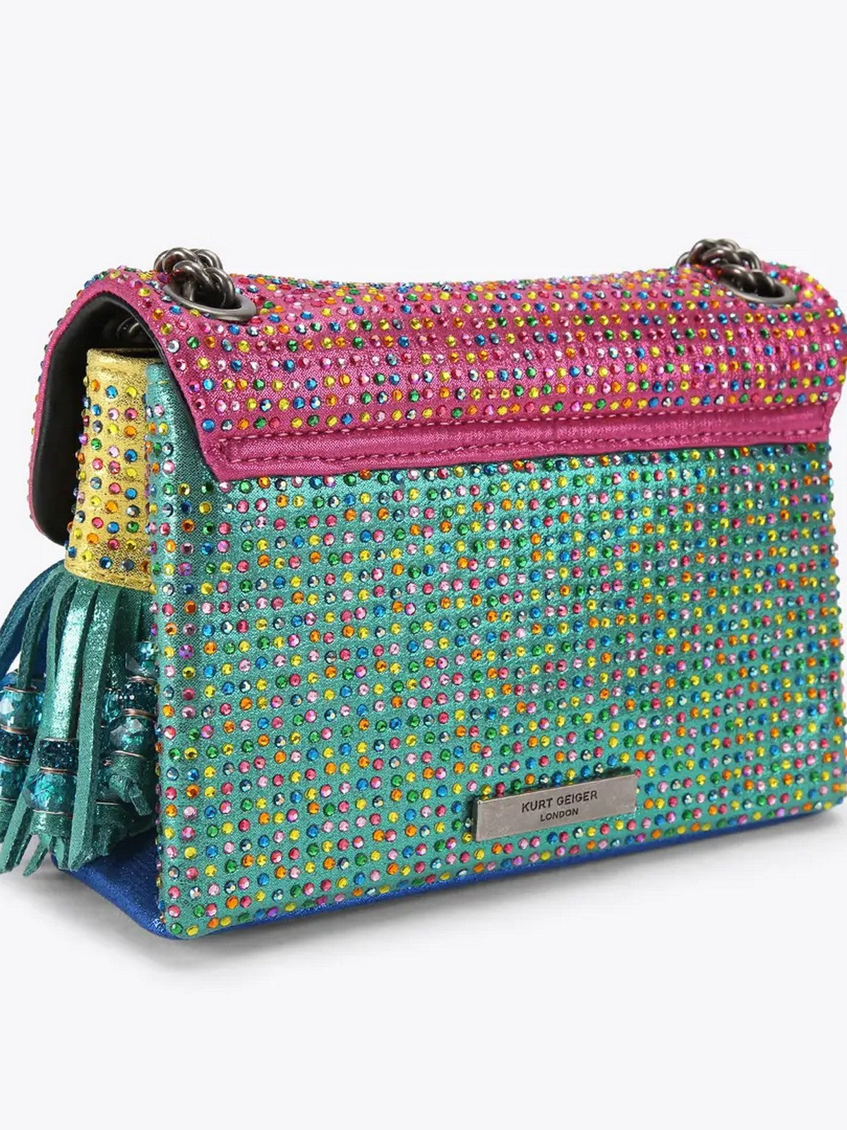 Borsa KURT GEIGER Mini Kensington realizzata in tessuto metallizzato rosa e verde con decorazioni in cristalli multicolore. Sotto la patta frontale sono presenti numerose nappe metalliche con perline di cristallo.