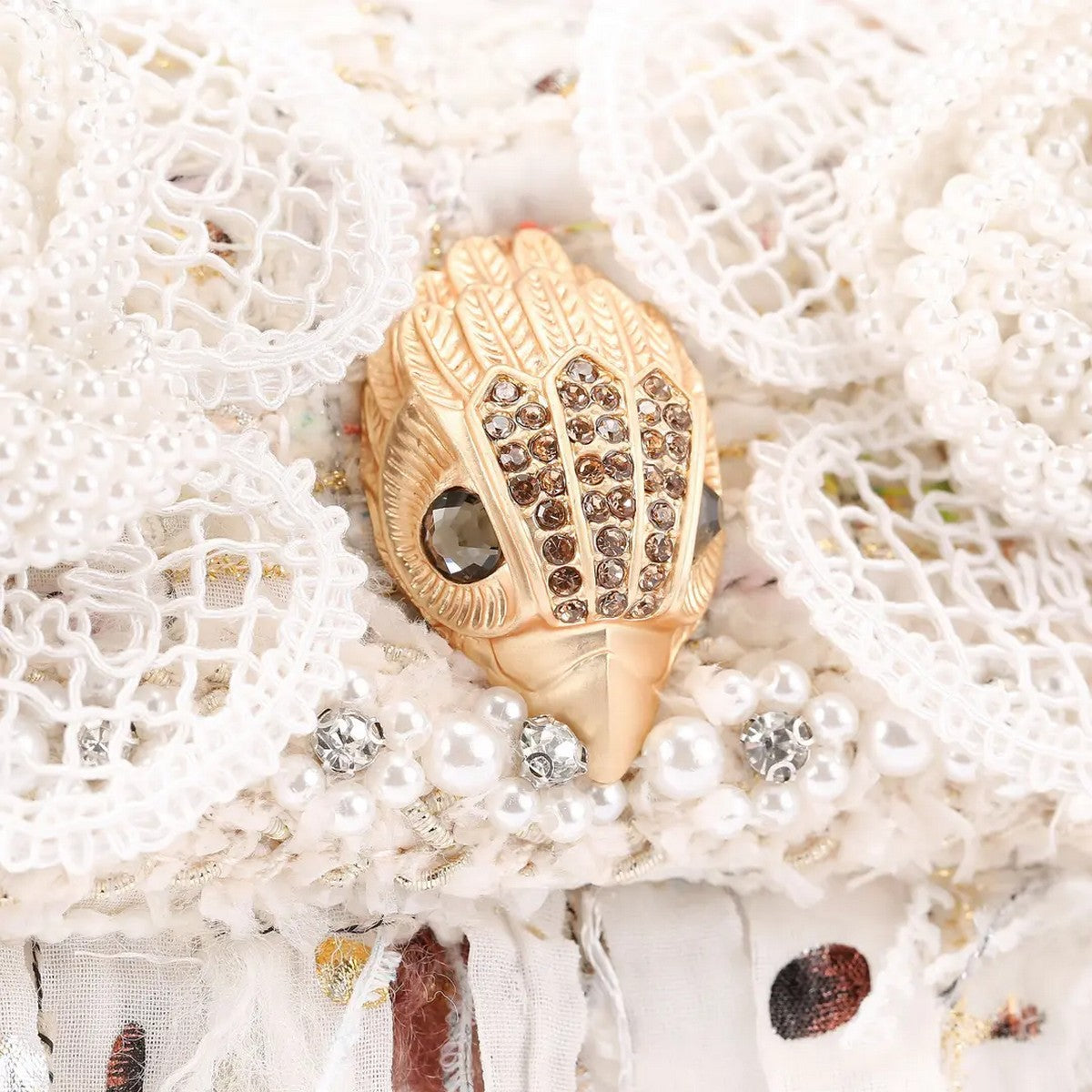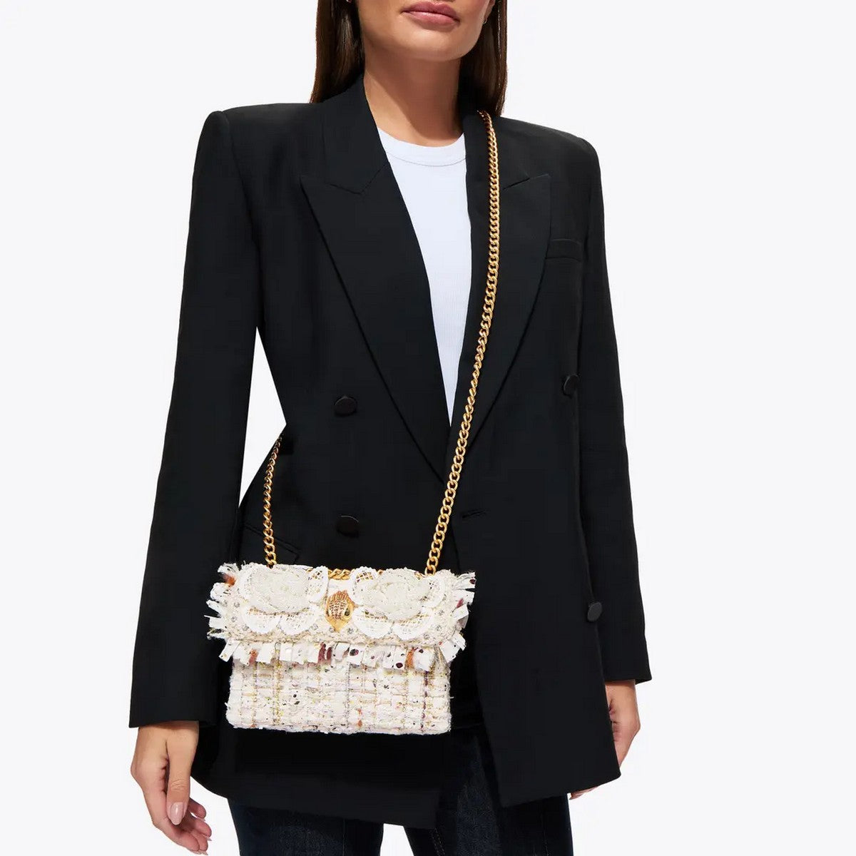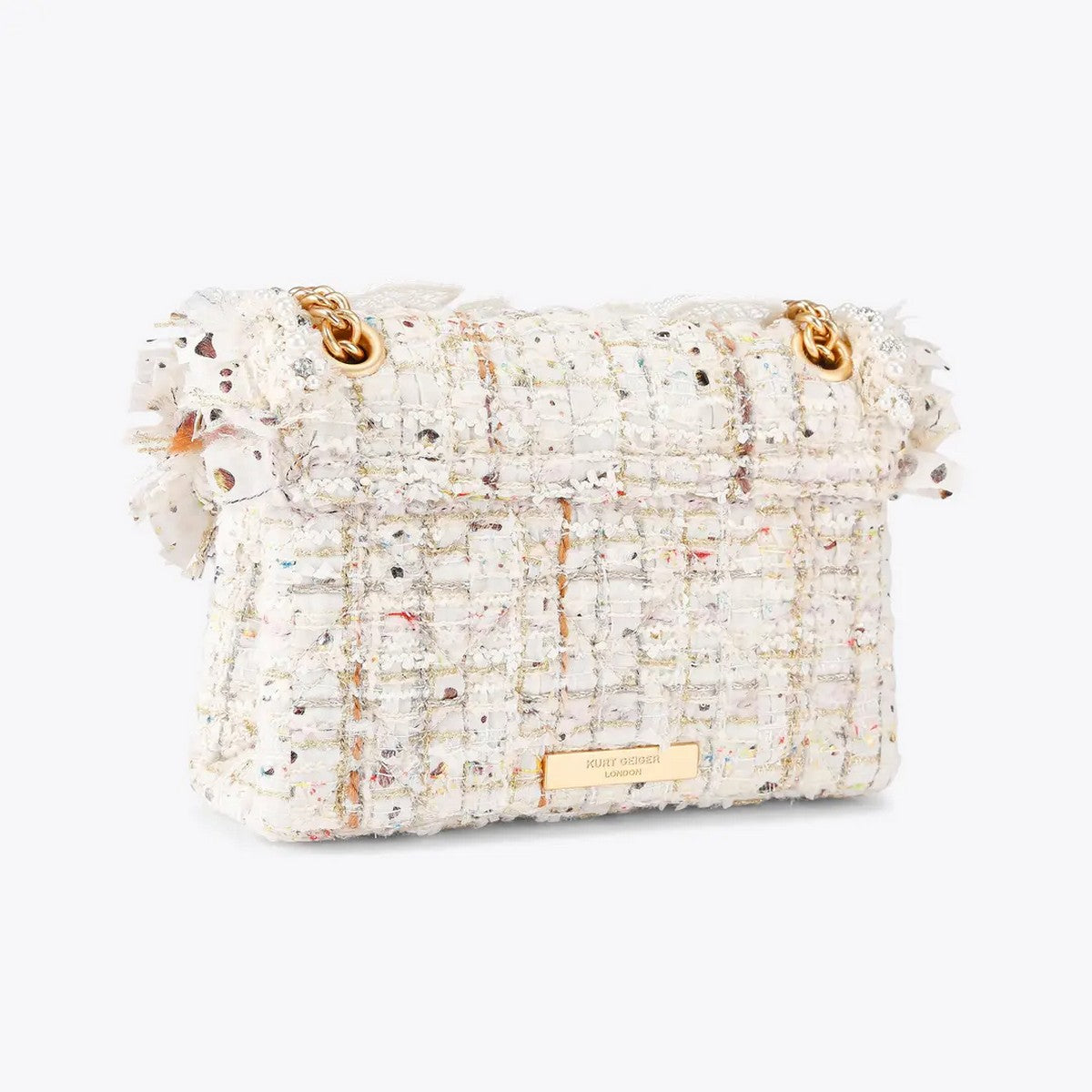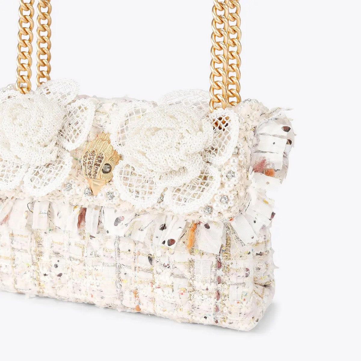 Borsa Kensington Mini in Tweed KURT GEIGER realizzata in tessuto tweed color osso. La patta frontale è impreziosita da due fiori in perle sintetiche e da una testa d'aquila in oro spazzolato.