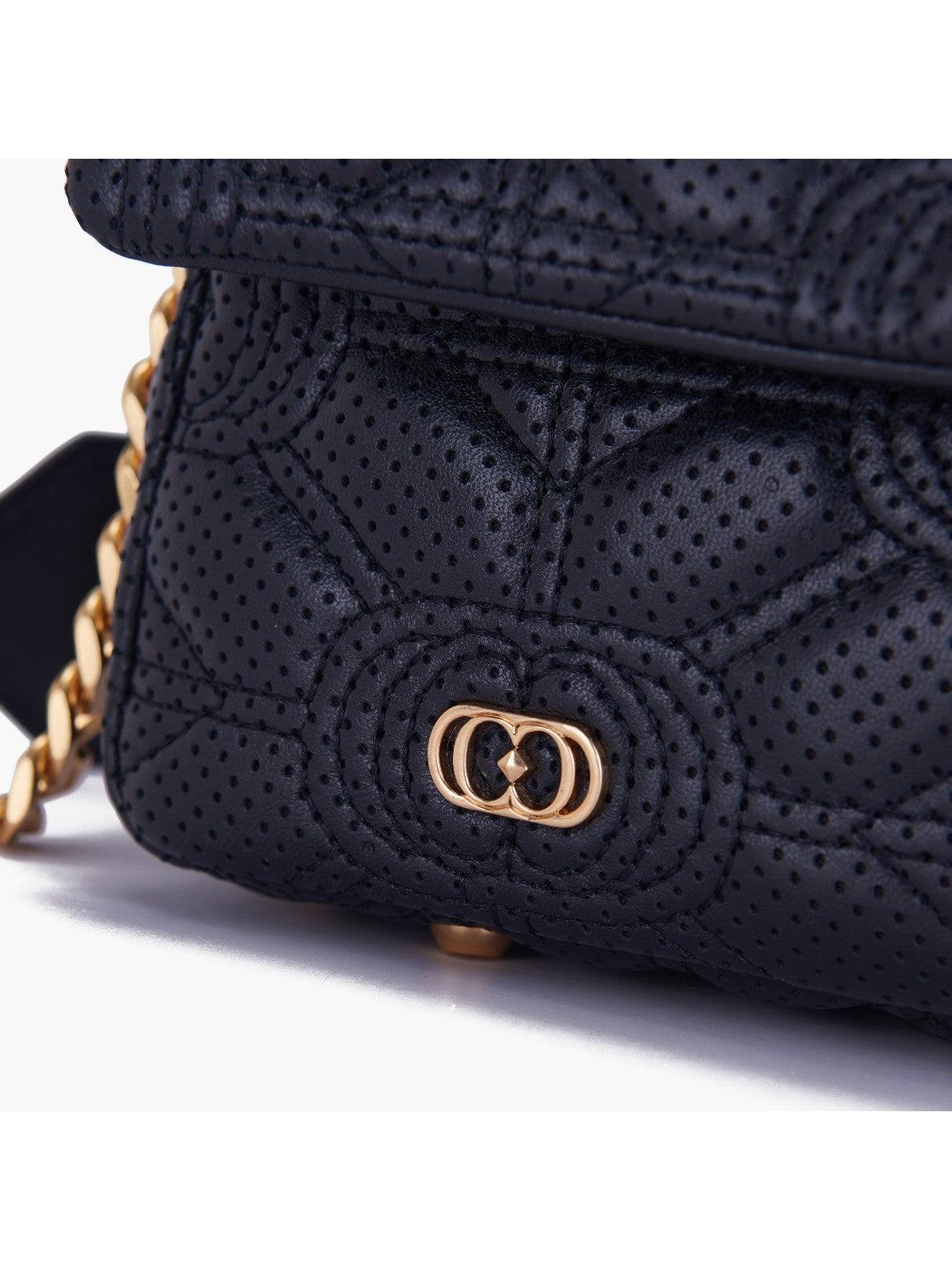 Borsa LA CARRIE in pelle nappata traforata e trapuntata. Chiusura con patta e bottone automatico. Manico a catena e tracolla di servizio removibile. Logo in metallo sul fronte. Interno foderato.