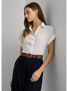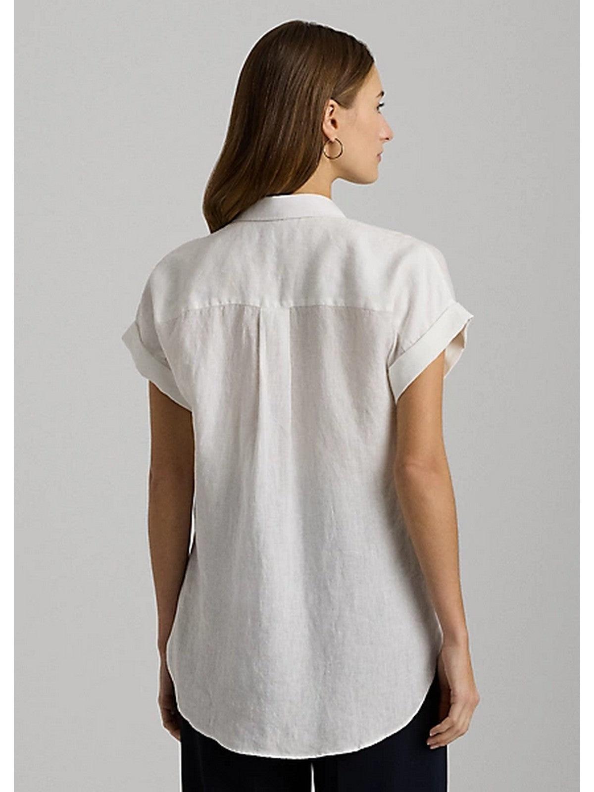 Camicia LAUEREN RALPH LAUEREN realizzata in lino. Con maniche corte a kimono e fondo manica arrotolati. Collo a punta. Cannoncino con bottoni al centro sul davanti. Carré posteriore con pieghe a cannoncino. Lembo orlato asimmetrico. Taglio morbido e comodo. Lunghezza ai fianchi.
