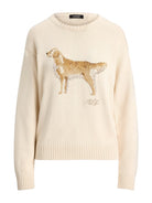 ? Golden retriever in maglia a intarsi e logo "LRL" ricamato sul torace.