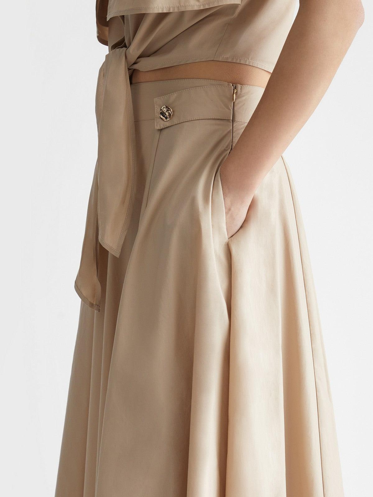 Motivo a pieghe. Bottoni gioiello in vita. Chiusura con zip invisibile sul fianco.