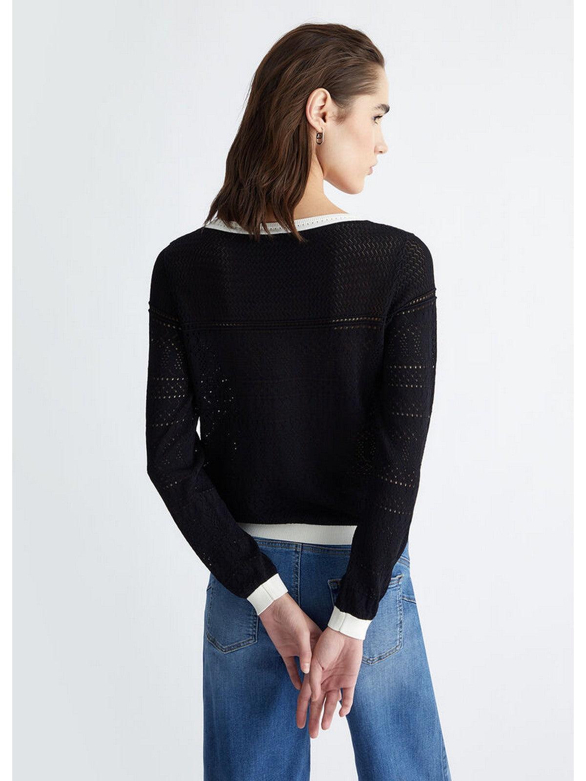 Maglia LIU JO realizzata in misto viscosa, lavorazione grafica punzonata all over. Scollo a barca e maniche lunghe con bordi a contrasto. Tasche decorative sul fronte con bottone logato