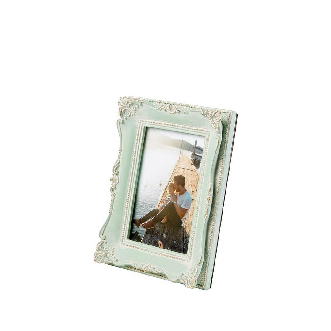 Portafoto rettangolare in resina. Grazie al decoro dall'effetto anticato e ai piccoli riflessi dorati, i ricordi più belli arrederanno la casa con delicata eleganza. Disponibile anche versione grande.