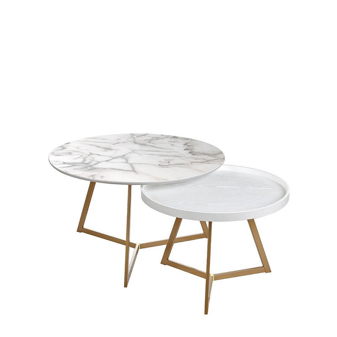 Set con 2 tavolini tondi con struttura in metallo dorata e piano bianco in legno. Linee eleganti e differenti finiture rendono questa composizione perfetta per chi desidera arredare la casa con eleganti complementi d'arredo dal design esclusivo.