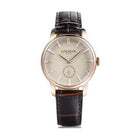 Orologio unisex con cassa in acciaio rosato e cinturino in pelle marrone con chiusura ad ardiglione. Movimento al quarzo con piccoli secondi al sei. Diametro cassa mm 36. Impermeabile fino a 5 bar. Completo di scatola