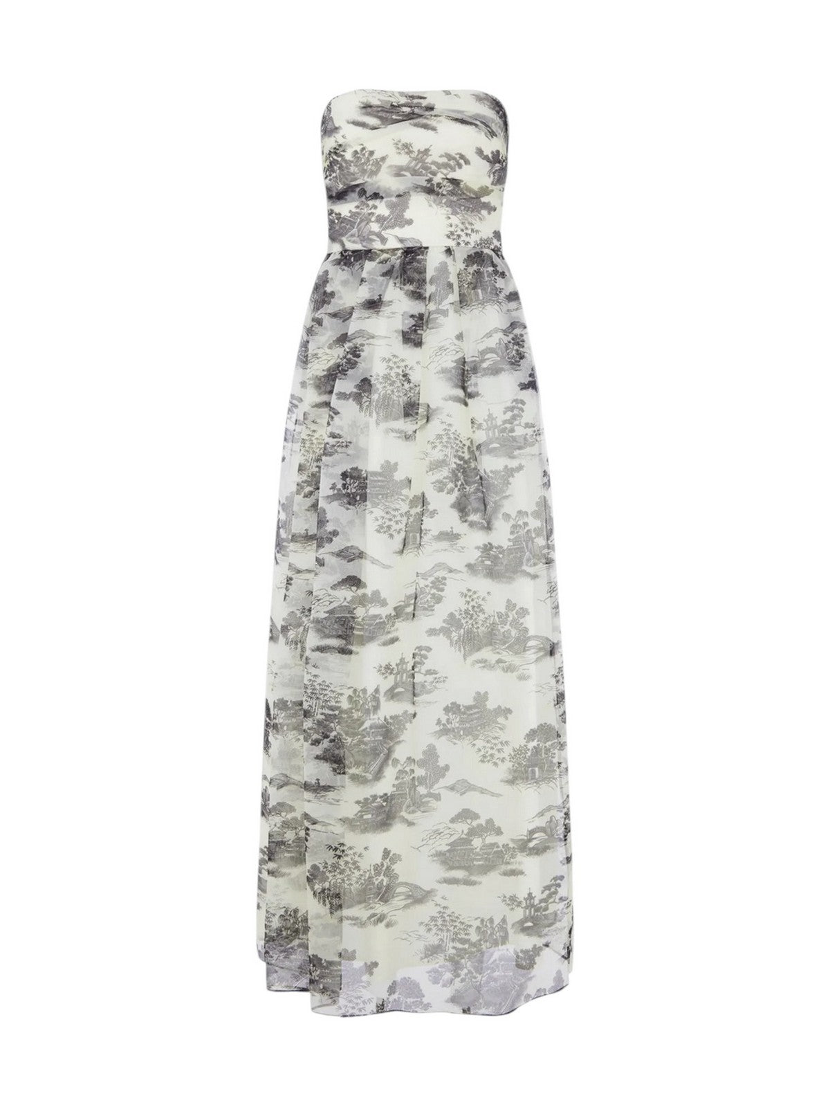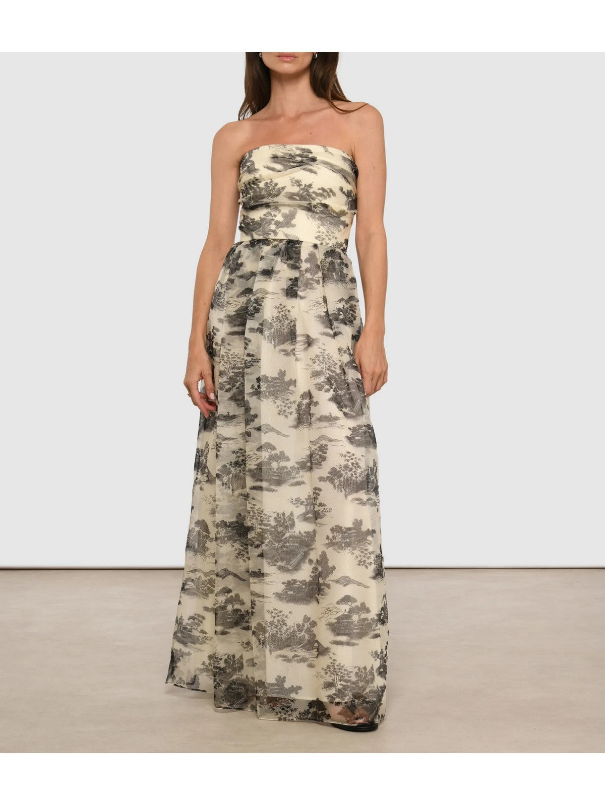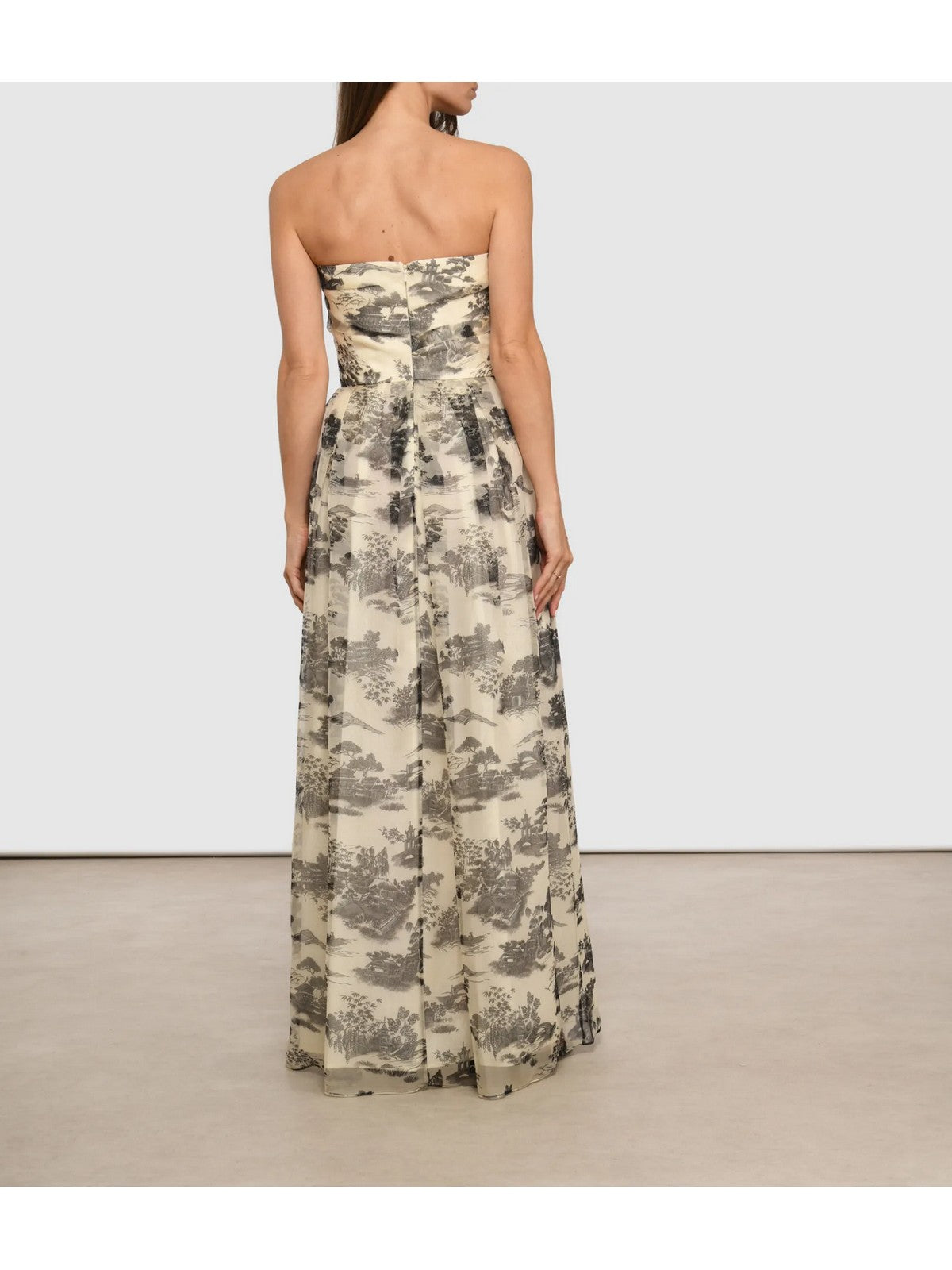 Abito lungo bustier MAX MARA STUDIO in organza di pura seta con motivo stampato all over caratterizzato da gonna ampia con taglio in vita.