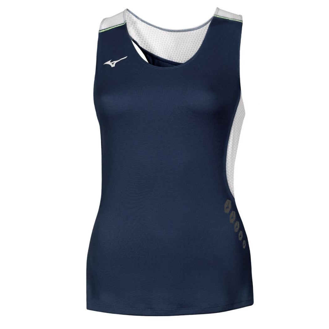 Canotta running Mizuno da donna. Canotta Mizuno per il running in tessuto leggero e traspirante con tecnologia mizuno DRYLITE ®, mesh Jaquard laterale per garantire una migliore performance, stampa Hex Runbird e dettagli fluo in contrasto. Salbini articoli tecnici per lo sport.