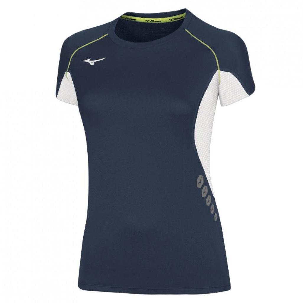 T-shirt running Mizuno da donna. Maglietta Mizuno a manica corta da running in tessuto leggero e traspirante con tecnologia mizuno DRYLITE ®, mesh Jaquard laterale per garantire una migliore performance, stampa Hex Runbird e dettagli fluo in contrasto. Salbini articoli tecnici per lo sport.