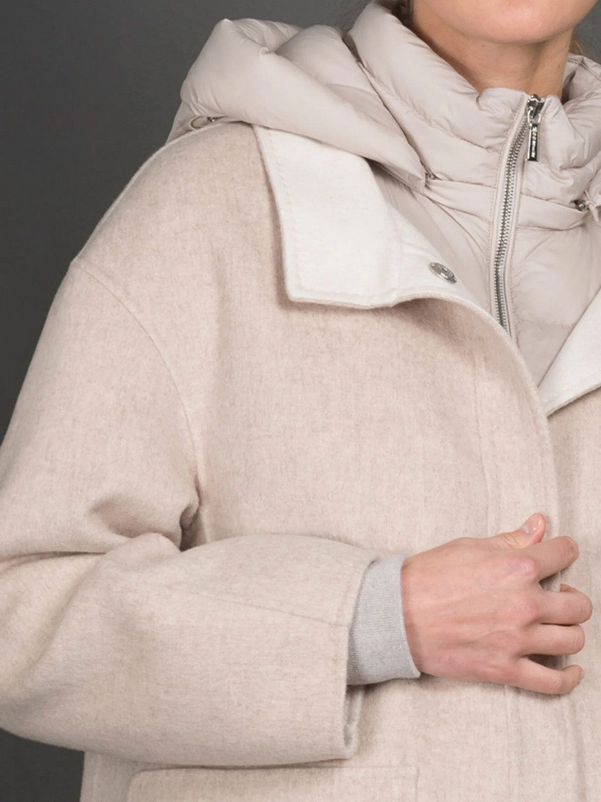 Piumino/Parka MOORER "NATISHA-CWB" reversibile in lana dalla linea over, unito a un caldo piumino staccabile che permette di essere indossato in diverse combinazioni.