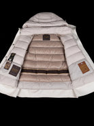 Al suo interno il pratico piumino staccabile imbottito in finissima piuma d'oca trapuntato a boudin e realizzato con un setoso nylon super light down proof.
