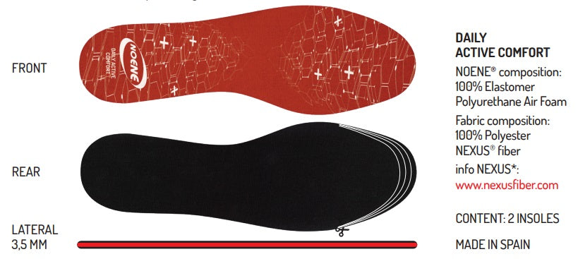 Le solette DAILY ACTIVE COMFORT sono composte da un triplice strato: • struttura noene ®, con uno spessore di solo 1 mm che assorbe fino al 96% le vibrazioni negative a cui è soggetto il nostro corpo mentre si cammina, durante l'impatto piede-suolo. • struttura in Air Foam dello spessore di 2mm che fornisce una sensazione di morbidezza e benessere, è in grado di distribuire il carico del piede e le pressioni, in modo uniforme. • tessuto attivo Nexus ® antibatterico e termoregolatore fornisce sollievo, migliora la circolazione e il recupero funzionale. Le solette noene Daily Active Comfort si adattano al piede e offrendo un'elevata sensazione di benessere. PROTEGGONO senza cambiare la sensazione della tua scarpa. Ideali per tutte le persone che svolgono quotidianamente attività statiche e chi passa molte ore in piedi, si inseriscono sopra la soletta originale (over-sole) e sono ritagliabili. La confezione contiene n. 2 solette . Salbini articoli tecnici per lo sport è rivenditore ufficiale Noene .