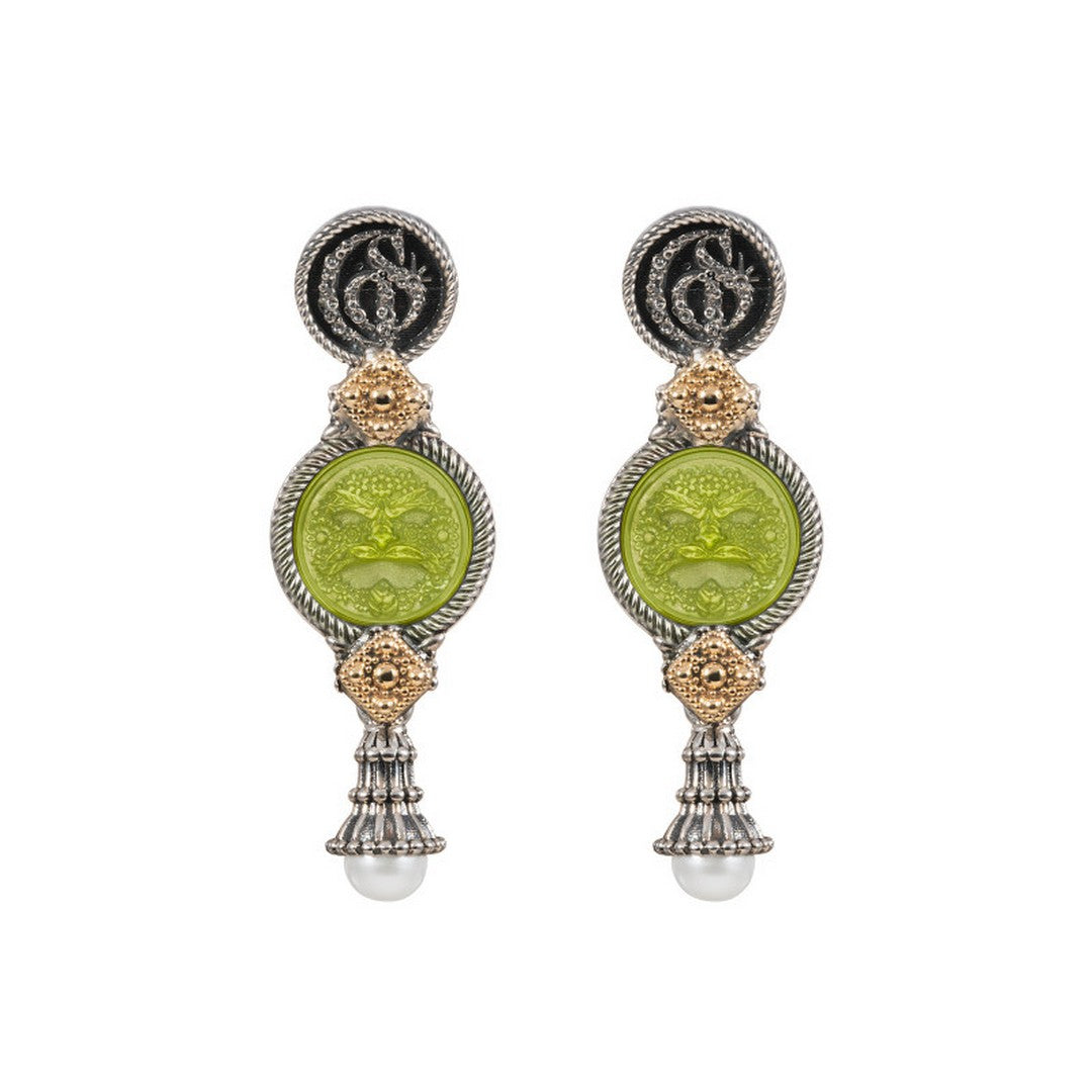 Orecchini pendenti Gerardo Sacco in oro 9 kt e argento 925, con paste vitree incise e perle. Un omaggio all'armonia neoclassica, esaltato da castoni lavorati a mano. Riferimento 35128.