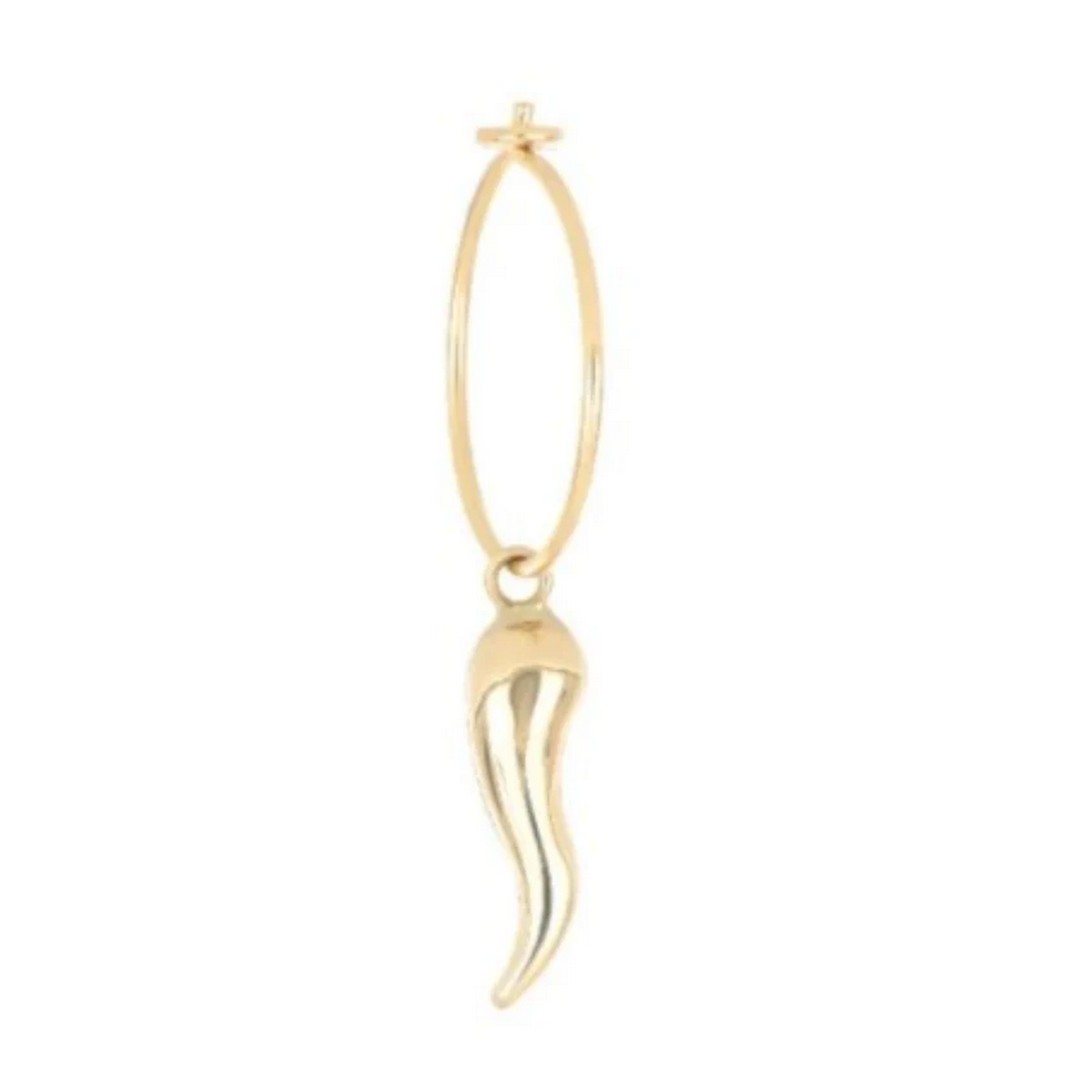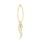 Orecchino a cerchio mini singolo in oro giallo 18 carati con cornetto pendente di lunghezza 1,5 cm.