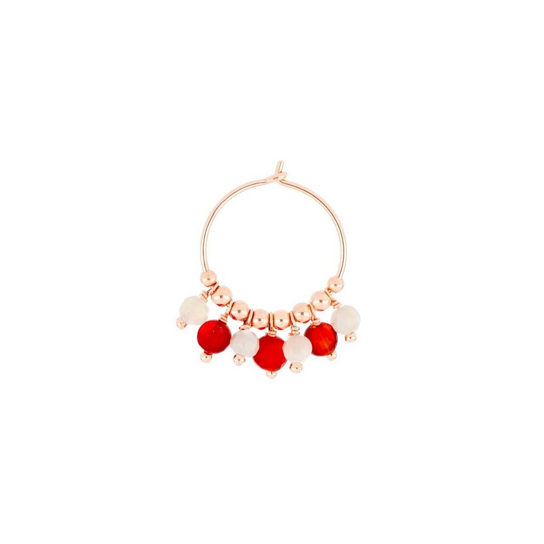Orecchino a cerchio singolo con pietre di madreperla e corniola pendenti e sfere decorative in argento.