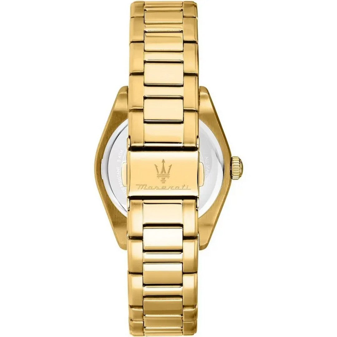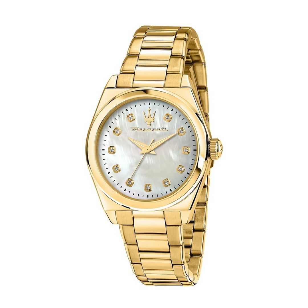 Orologio solo tempo da Donna MASERATI della collezione VELOCITA' con movimento al quarzo, cassa 35 mm in acciaio inox PVD gold, spessore della cassa 9.00 mm, quadrante analogico in madreperla bianca con indici impreziositi da luminosi cristalli bianchi, lancette con inserto luminescente in modo che l'ora sia leggibile anche in condizioni di scarsa illuminazione e vetro minerale - Il cinturino è in acciaio inox PVD gold con finitura lucida e satinata e monta una chiusura deployante con apertura a doppio pulsante - Orologio impermeabile a 5 ATM - Garanzia Internazionale: 24 Mesi
