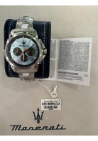 Questo orologio Maserati ha una cassa in Inox con un diametro di 42 mm ed è dotato di un cinturino in Metallo. All'interno della cassa si trova un movimento di Miyota e l'orologio è dotato di un cristallo di Minerale.