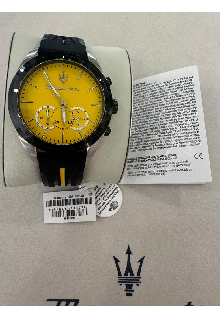 Quadrante analogico giallo con indici a bastoni e logo a ore 12.