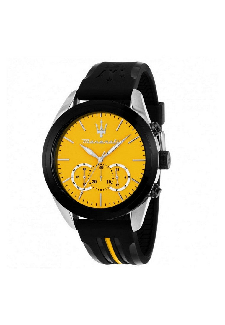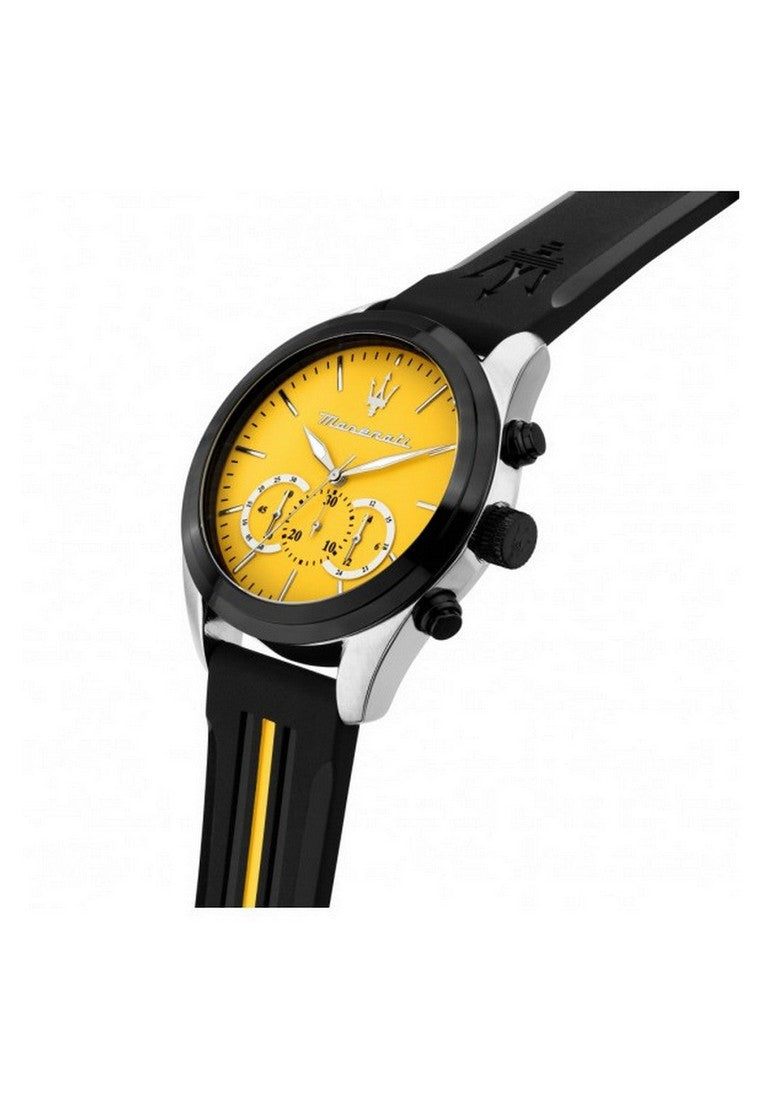 Cinturino in silicone nero con dettaglio giallo; chiusura con fibbia ardiglione.