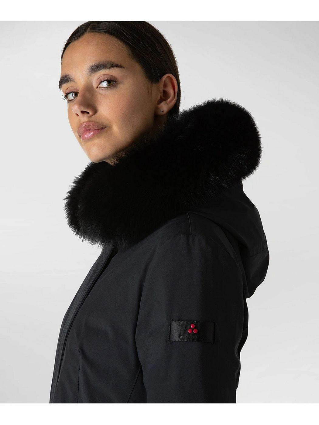 Giubbino Peuterey in piuma riciclata e tela di nylon stretch. Con cappuccio fisso e vera pelliccia rimovibile. Chiusura con zip coperta da patta con bottoni. Due tasche laterali con patta. Antipioggia e antivento. Logo su manica. Vestibilità slim
