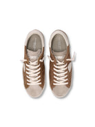 Sneaker PHILIPPE MODEL Prsx si presenta con tomaia in camoscio cognac con dettagli di spoiler e scudo a lato in color beige