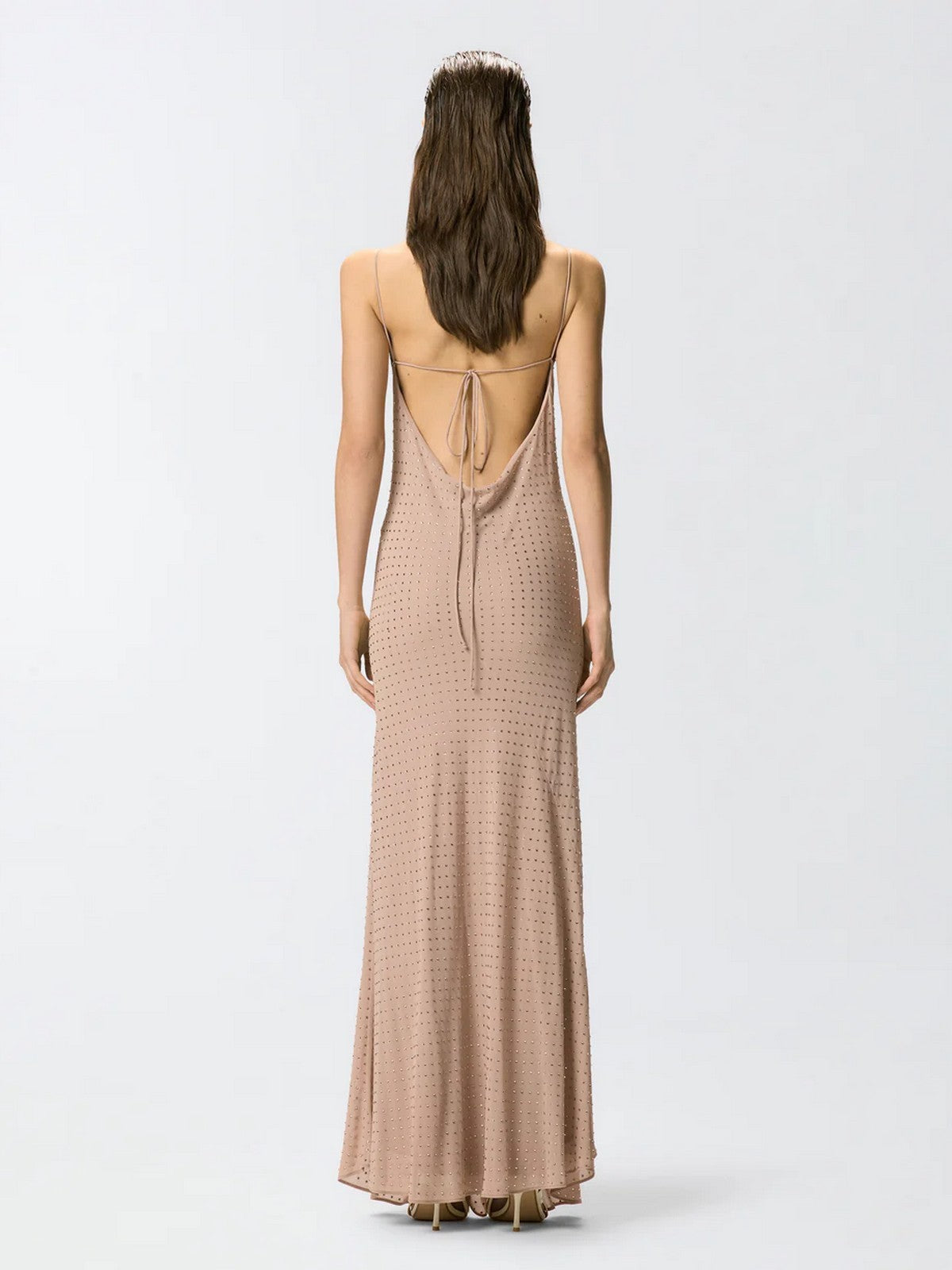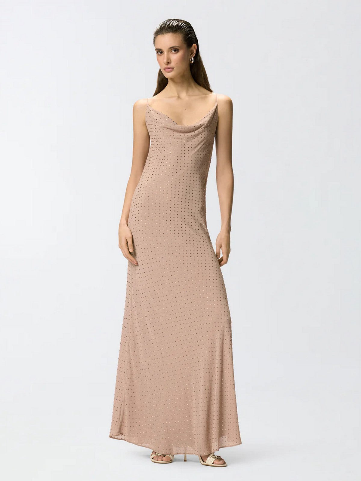 Abito lungo PINKO realizzato in un tessuto georgette dal raffinato aspetto opaco che accompagna il corpo con delicatezza e permette di ottenere una silhouette fluida e leggera, ed è impreziosito da brillanti strass disposti su tutta la superficie del capo