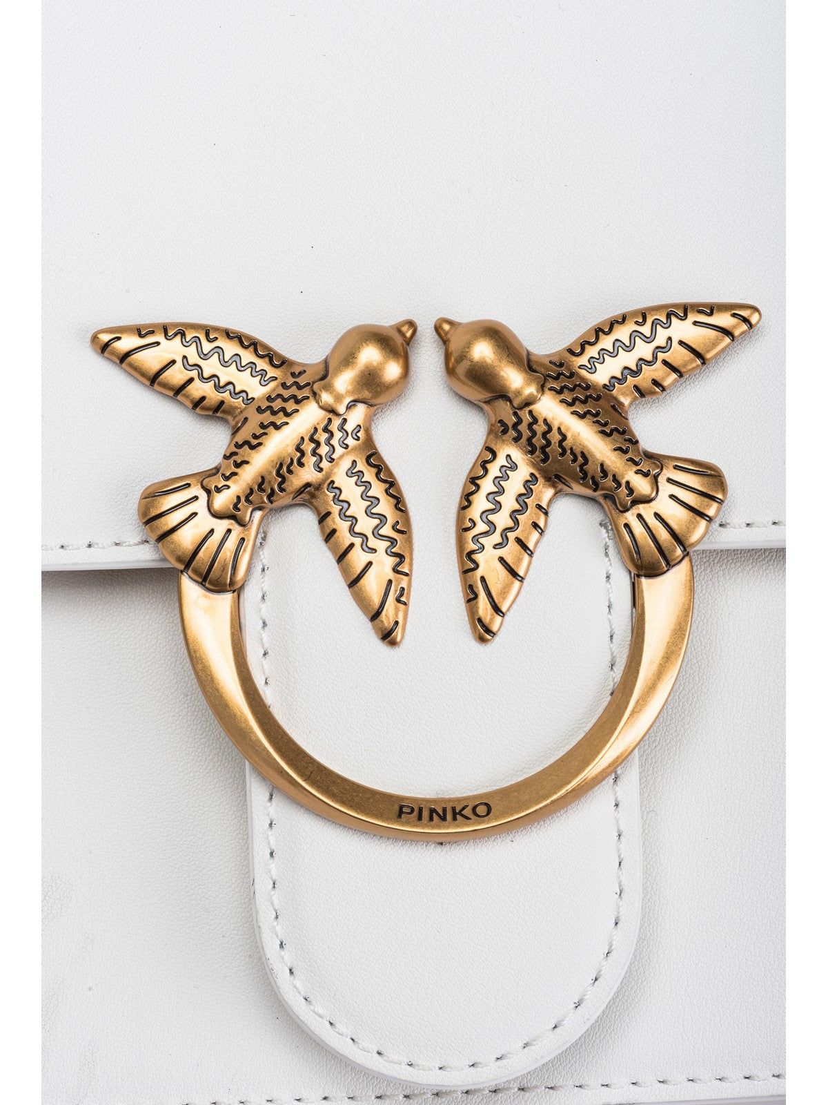 Chiusura con patta e bottone automatico completata dall'iconica fibbia in metallo Love Birds Diamond Cut.