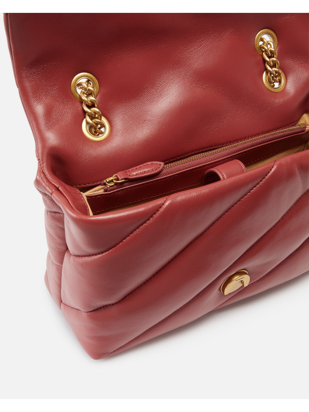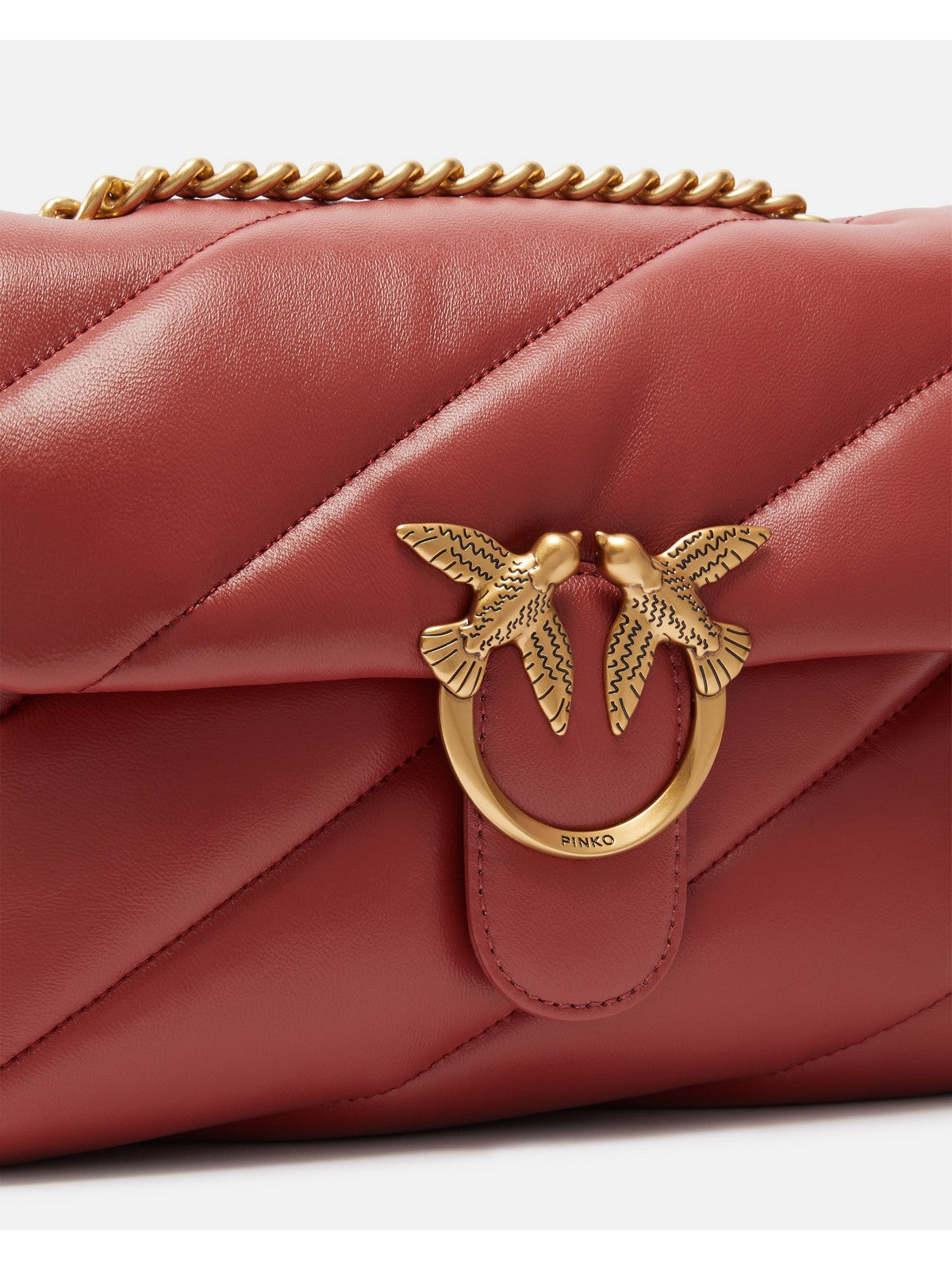Borsa PINKO Classic Love Bag Puff in morbida nappa con maxi trapuntatura obliqua. Chiusura con patta e bottone automatico completata dall'iconica fibbia in metallo Love Birds Diamond Cut. Interno foderato in microfibra scamosciata con tasca a parete composta da tre scomparti di cui uno con zip. La tracolla combina la classica catena metallica rotonda al pratico spallaccio in nappa.