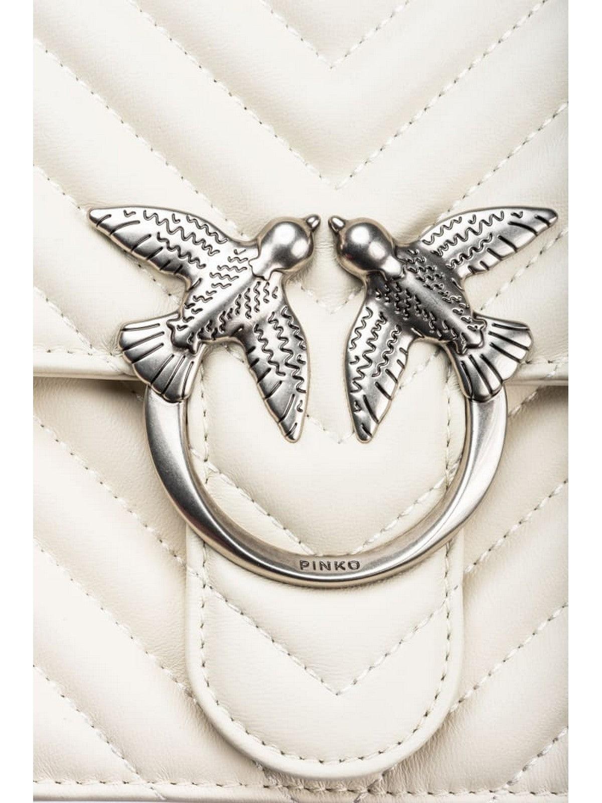 Borsa PINKO Classic Love Bag One in nappa trapuntata con motivo chevron. Chiusura con patta completata dall'iconica fibbia Love Birds Diamond Cut in metallo. L'interno è foderato in microfibra scamosciata e comprende tramezza chiusa con zip e tasca a parete in pelle. La tracolla combina la classica catena rotonda al pratico spallaccio in pelle regolabile.