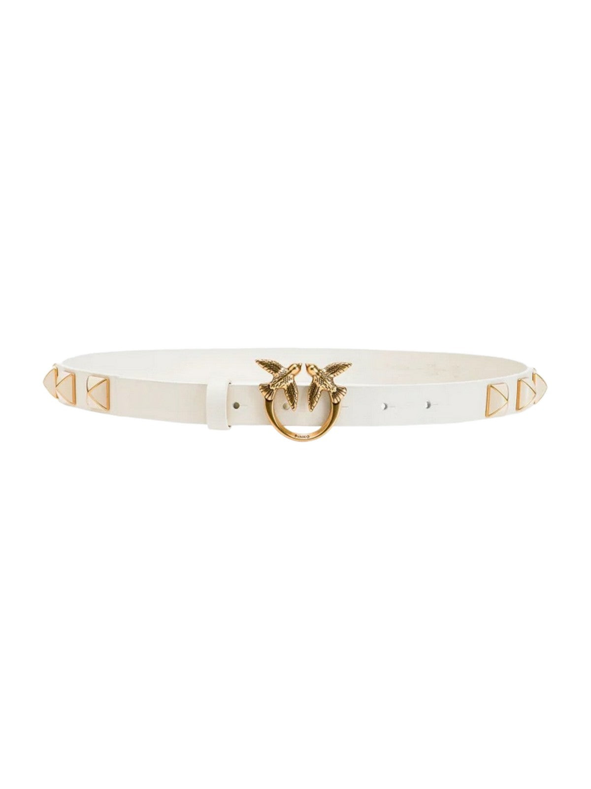 Cintura PINKO sottile in morbida pelle mano seta con borchie laterali smaltate a forma piramidale. Mini fibbia Love Birds Diamond Cut in metallo. Altezza 2 cm.