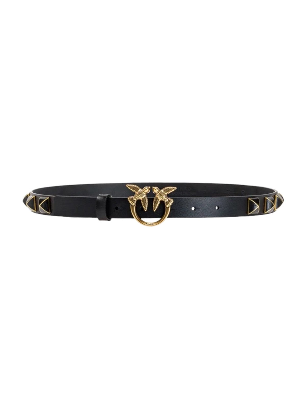 Cintura PINKO sottile in morbida pelle mano seta con borchie laterali smaltate a forma piramidale. Mini fibbia Love Birds Diamond Cut in metallo. Altezza 2 cm.