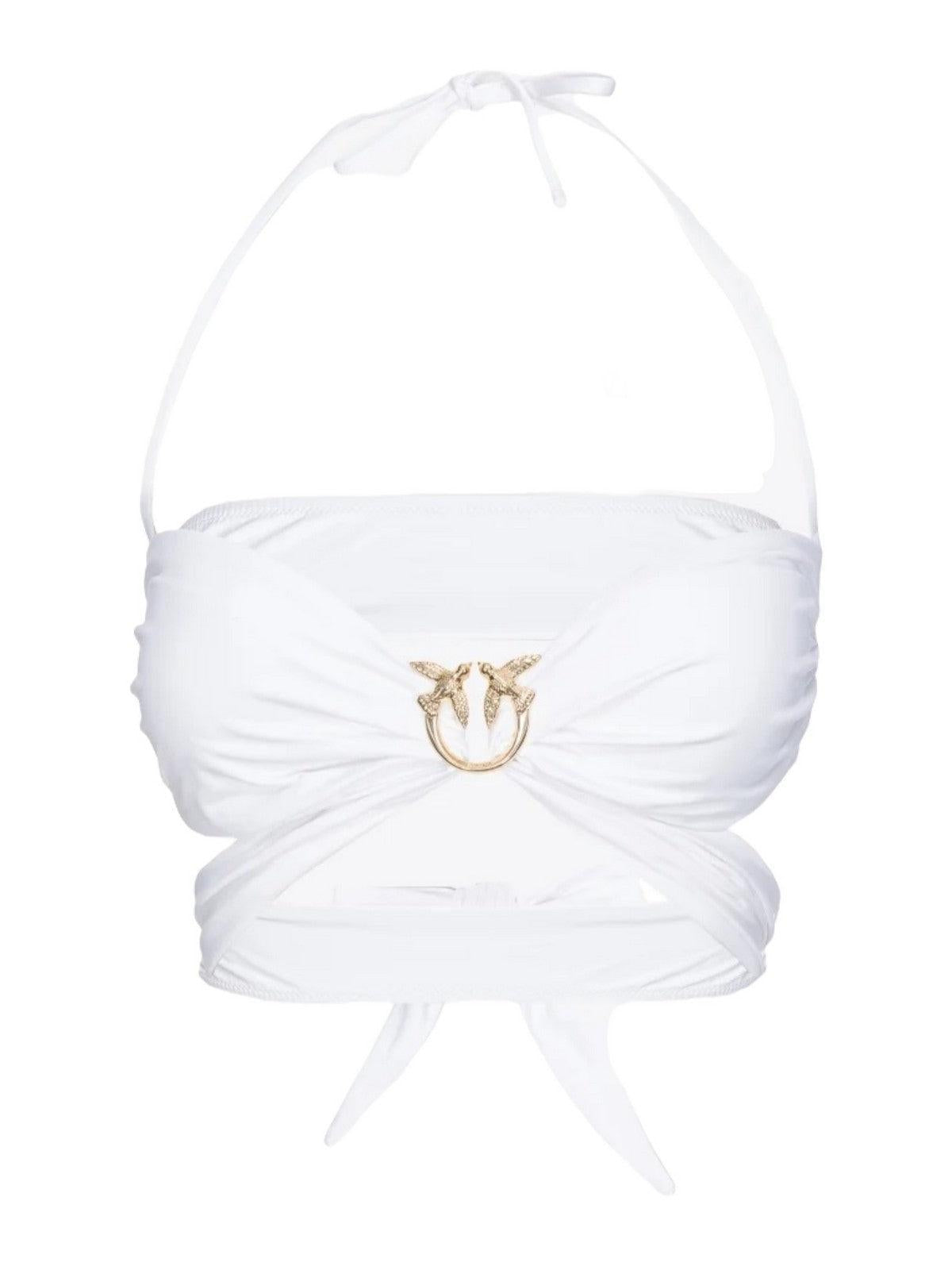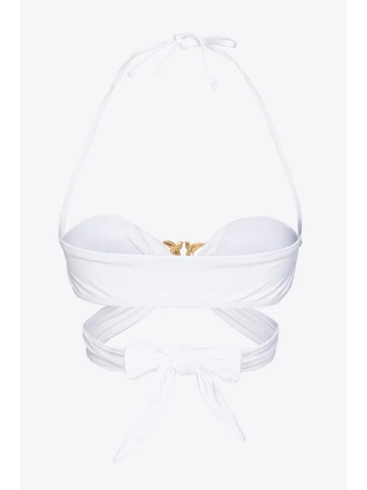 Top bikini PINKO in tecno jersey stretch con fibbia ad anello Love Birds Diamond Cut in metallo. Allacciatura sul retro del collo e fusciacca da annodare a piacere.