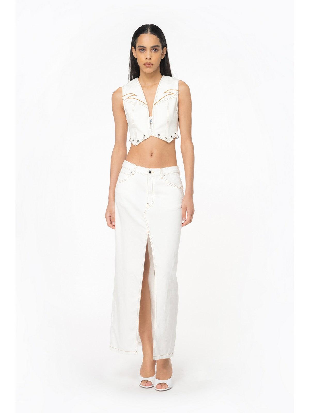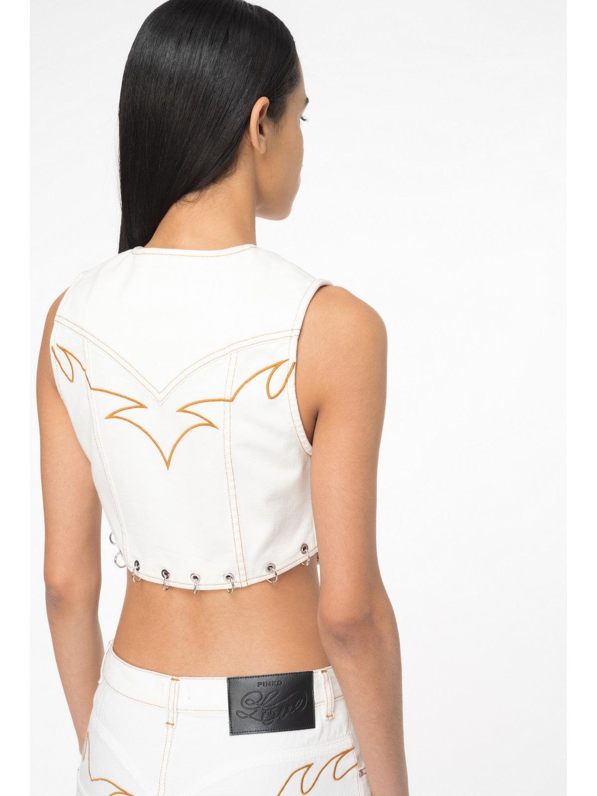 Gilet corto PINKO in bull di cotone slegato, dalla particolare mano morbida con ricamo tribale stile rodeo sia davanti che sul retro. Profondo scollo a V, impunture a contrasto e fondo capo con occhielli e accessori stile piercing in metallo. Chiusura con zip in metallo davanti.
