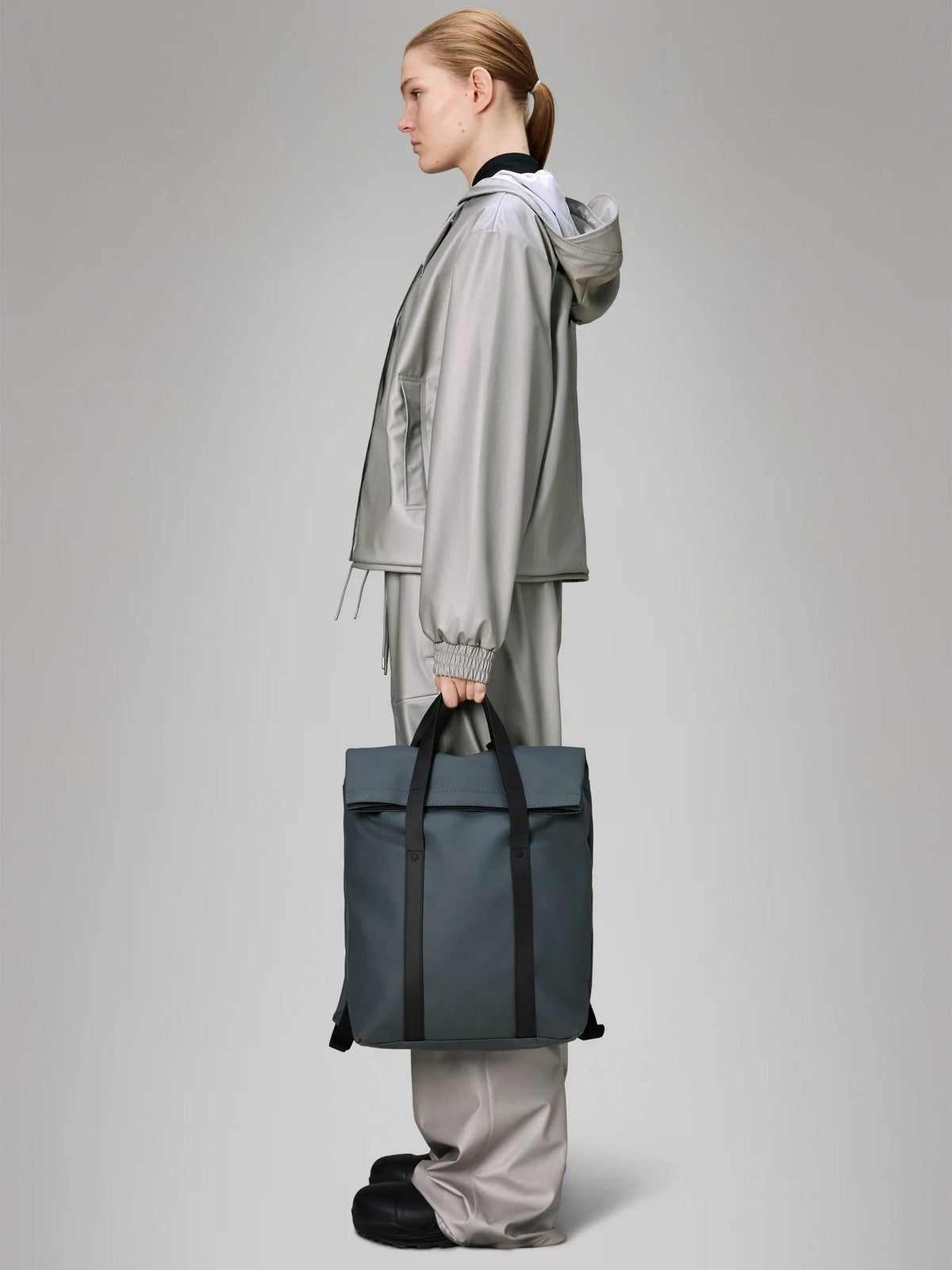 Zaino RAINS Way Tote Backpack realizzato con l'iconico tessuto PU di Rains, per garantire resistenza, durata e morbidezza al tatto.