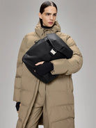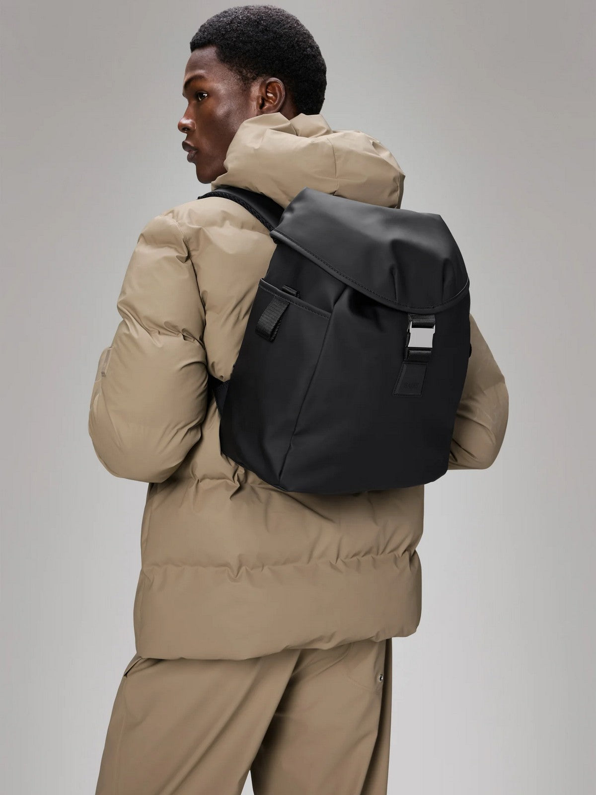 Zaino RAINS realizzato con l'iconico tessuto PU di Rains con rivestimento sul retro più morbido.