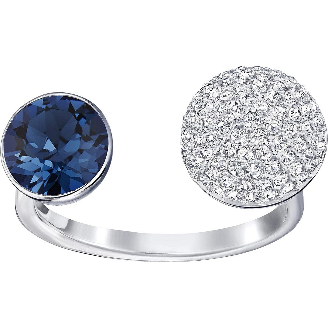 Un anello aperto Swarovski realizzato in metallo rodiato, caratterizzato da un cristallo blu su un'estremità e una sfera in pavé di cristallo trasparente sull'altra estremità.