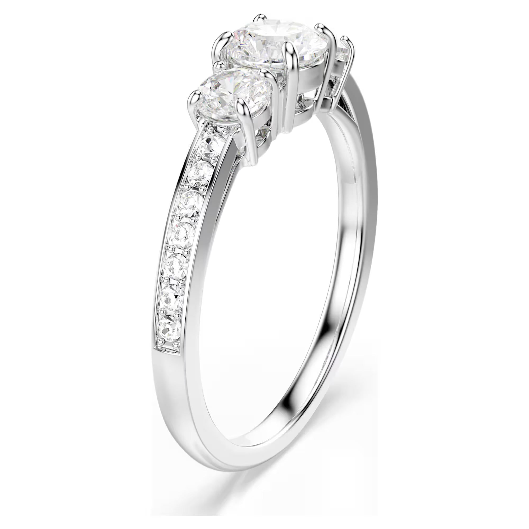 Adatta ad ogni occasione, la famiglia Attract evoca una disinvolta eleganza. Questo anello classico irradia una luce straordinaria grazie ai cristalli trasparenti e ad un trio di Swarovski Zirconia dal taglio di precisione montati su una brillante finitura color argento. Un bellissimo gioiello per tutti i giorni che può essere facilmente abbinato ad altri pezzi della famiglia Attract.
