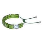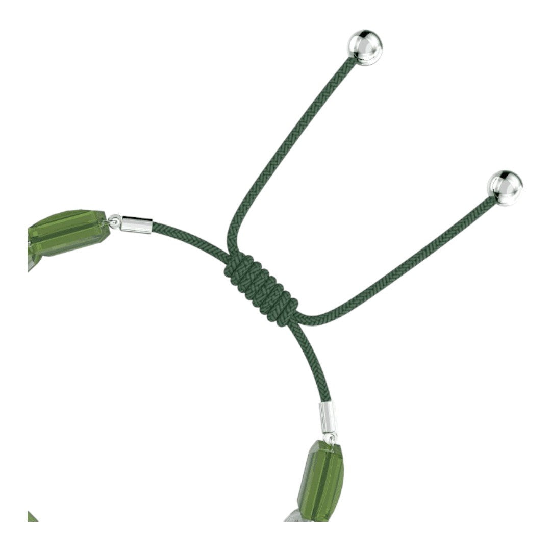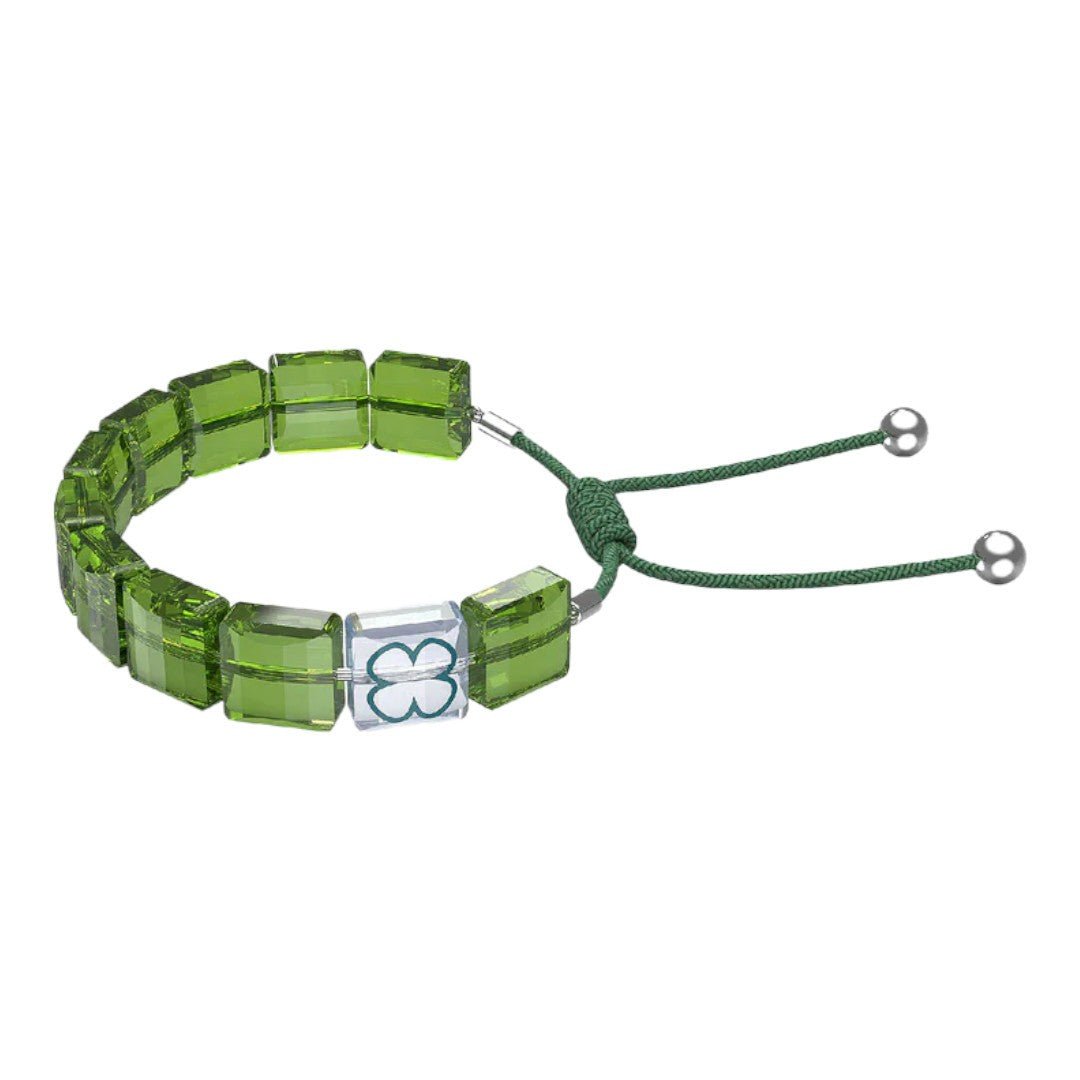 Bracciale della collezione Swarovski Letra da donna. Colore: verde. Il gioiello è realizzato con cristalli verdi taglio square e rifinito con un cordino regolabile in cotone cerato, ha un quadrifoglio stampato simbolo di buona fortuna. Chiusura a coulisse che garantisce la perfetta vestibilità.
