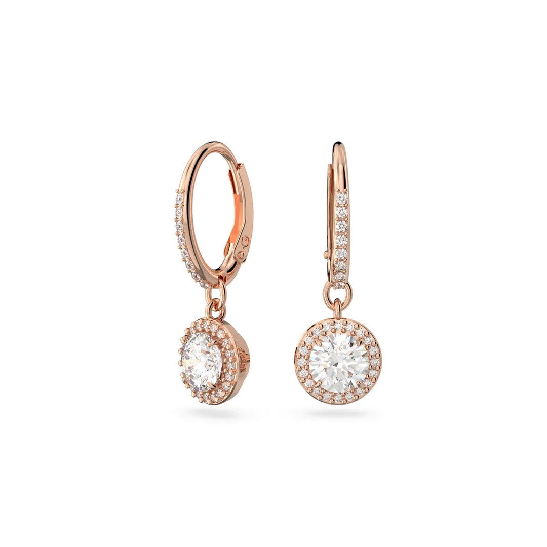 Orecchini monachella della collezione Swarovski Constella da donna. Colore: oro rosa. Gli orecchini sono in lega di metalli anallergica placcata oro rosa realizzati con pietre scintillanti circondate da pavé e rifinite da una montatura placcata. Lunghezza: 2.7 cm, larghezza: 0.9 cm. Chiusura a scattino.