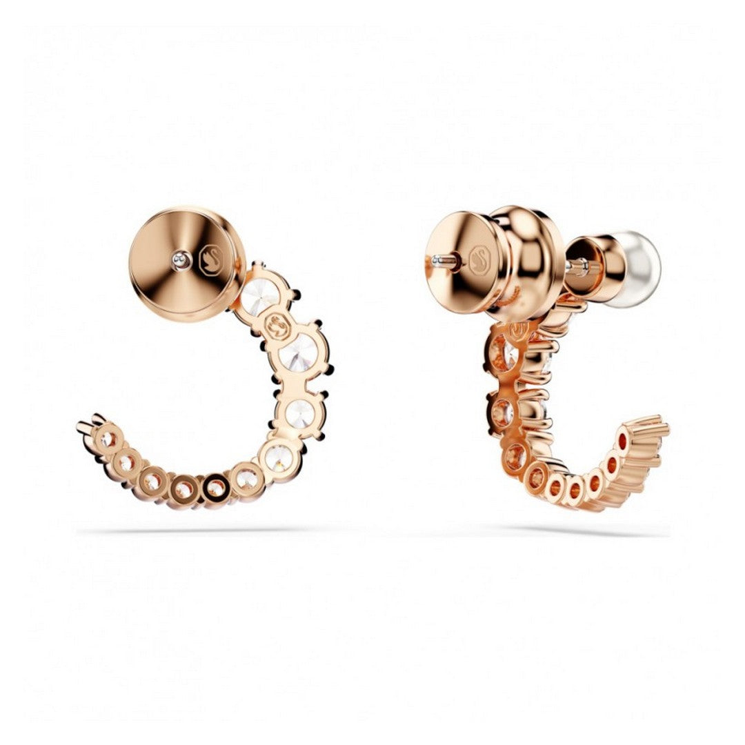 Orecchini da donna realizzati in lega di metalli con finitura rose gold; perla swarovski a lobo ed elemento impreziosito da cristalli swarovski bianchi.
