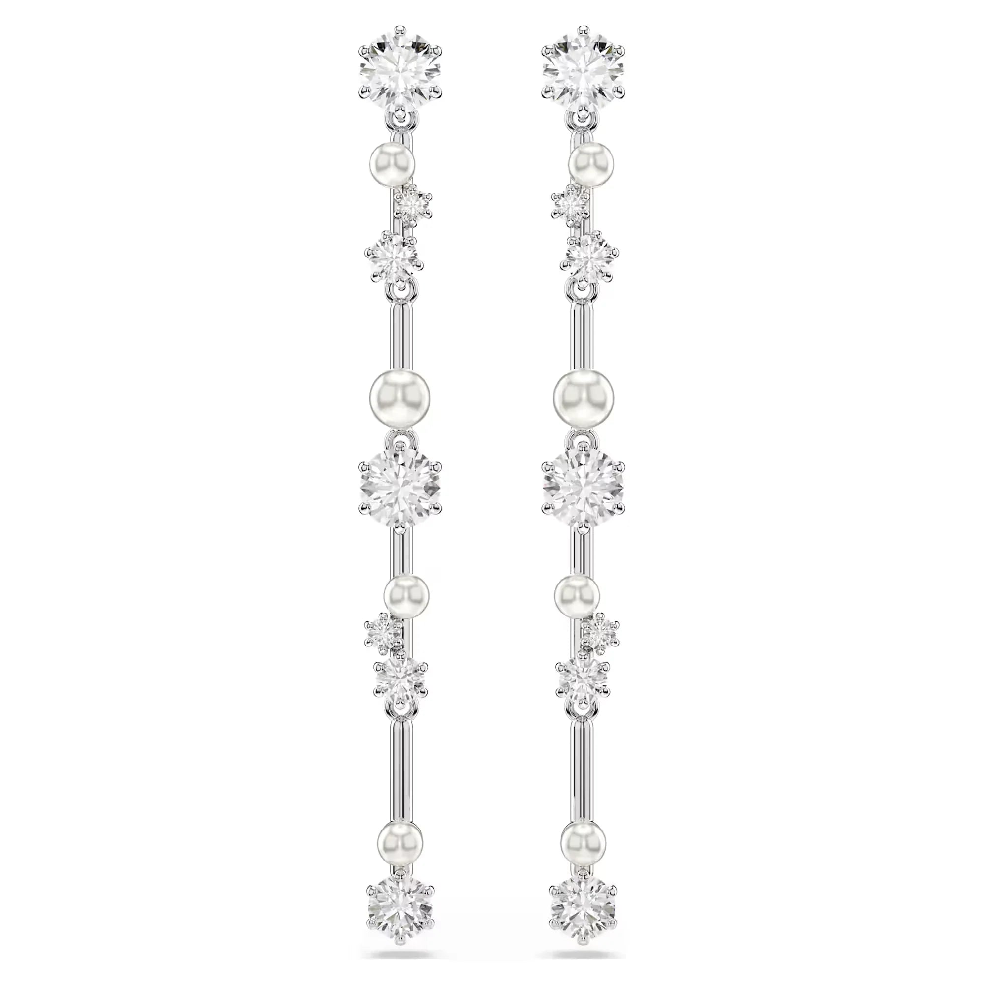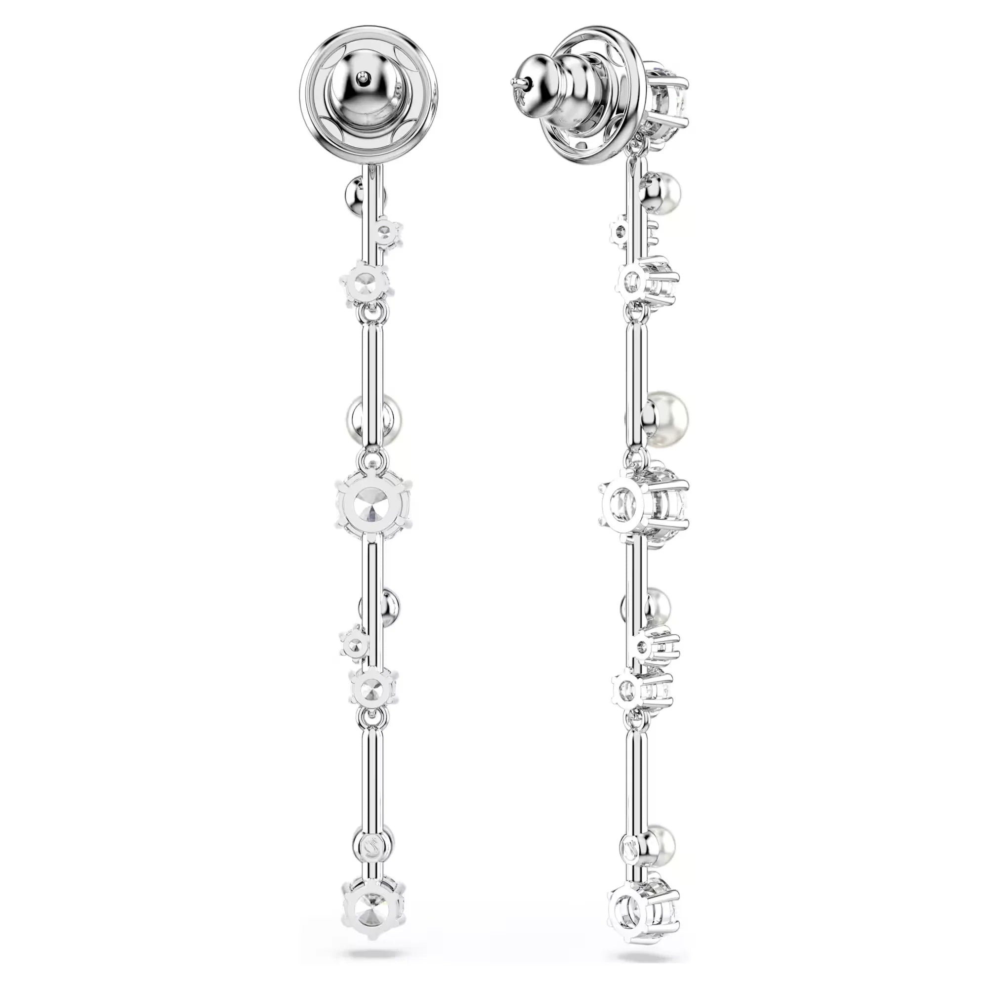 Come scie di polvere di stelle, questi orecchini pendenti Constella sono intrisi di magia e luce. Ciascuna creazione è placcata rodio e presenta un gruppo di Swarovski Zirconia e Crystal Pearls Swarovski di diverse dimensioni, che sembrano fluttuare tra le barrette metalliche del gioiello. Un'aggiunta sensazionale a qualsiasi outfit, per esaltare il tuo splendore cosmico.