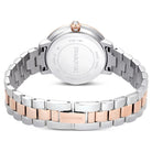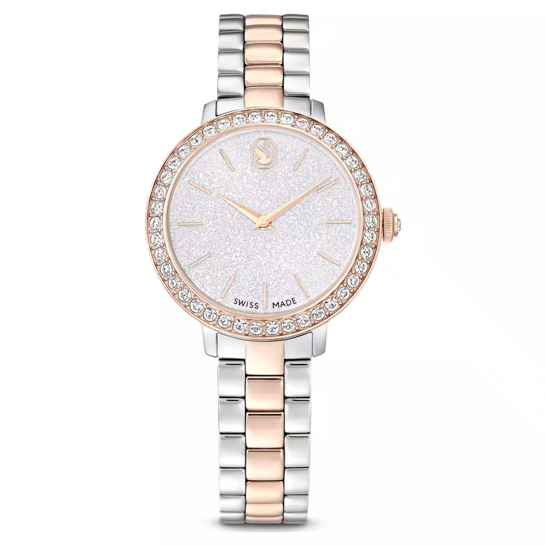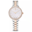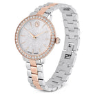 Ispirato ai gioielli Matrix di Swarovski, questo orologio da 30 mm cattura il medesimo senso di stile contemporaneo ed espressivo. Il design in acciaio inossidabile con finitura in tonalità oro rosa presenta una lunetta a pavé con 42 cristalli incastonati. Il quadrante, dalla splendida forma rotonda, è caratterizzato da un effetto glitter e include sottili indici e lancette, oltre al logo cigno a ore 12. Oltre a un ulteriore cristallo incastonato all'interno della corona, questo orologio si distingue per il suo bracciale a tre maglie, che scivola con eleganza attorno al polso. L'orologio Swiss Made è resistente all'acqua fino a 50 m ed è il compagno perfetto per ogni occasione.