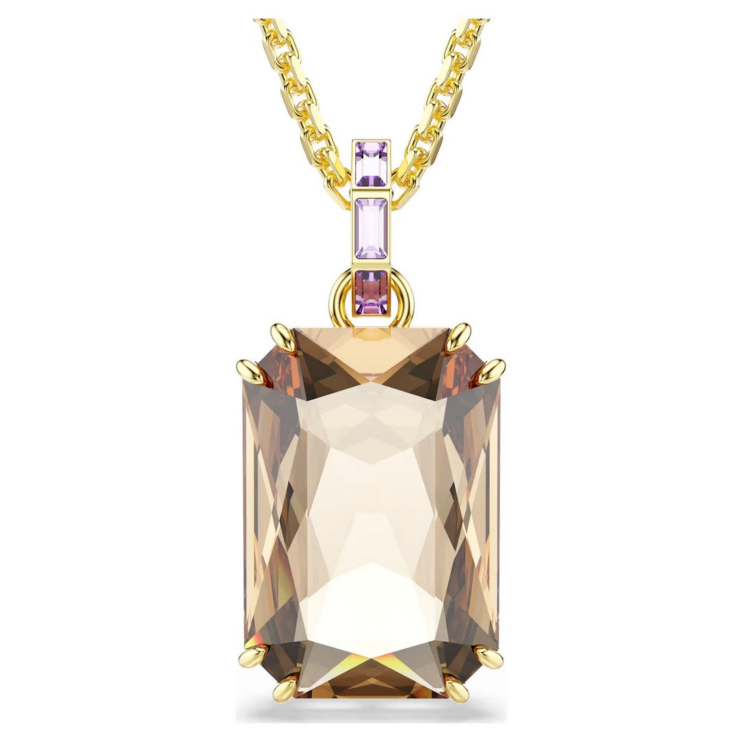 Questo luminoso pendente Millenia è una creazione di puro calore e lusso. Il motivo centrale è realizzato con un grande cristallo color caramello con una montatura a griffe doppia e si collega alla catena placcata in tonalità oro tramite un elegante passante impreziosito da cristalli viola con montatura a binario. Abbina questo pendente ad un paio di orecchini o a un bangle coordinati per esprimere un look ultra-moderno.