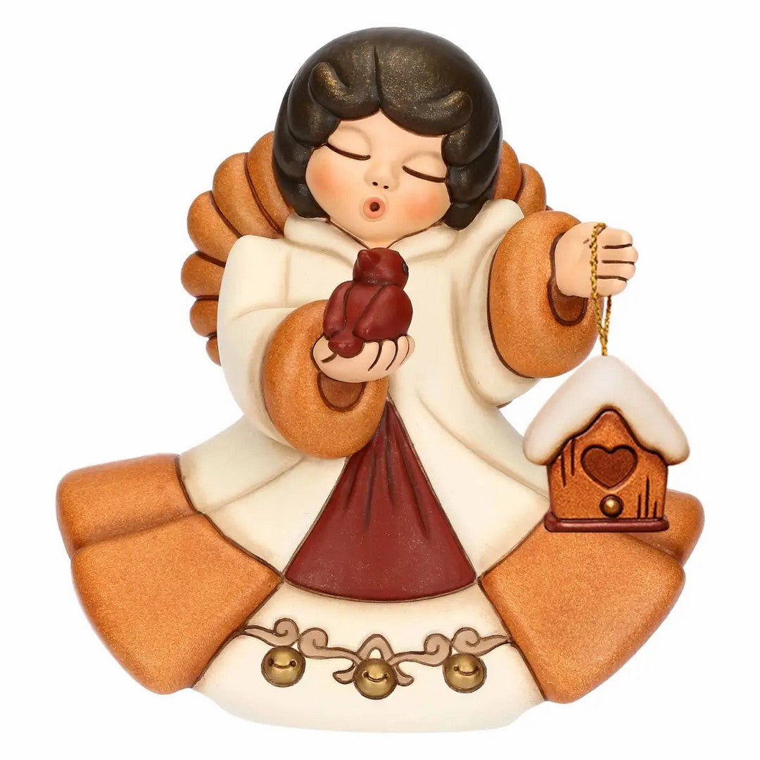 L'Angelo del Natale in ceramica Limited Edition si muove con grazia, facendo danzare la sua veste, nella sua versione media. Tra le sue mani protegge un tenero picchio rosso, che cinguetta una gioiosa melodia, rompendo il silenzio dell'inverno e portando con sé una promessa: anche nei giorni più bui, la gioia e il calore del Natale restano vivi. L'Angelo è compreso della sua casetta removibile, un rifugio sicuro per il picchio rosso in cui poter fare sempre ritorno, per preservare l'amore e i legami più solidi. Perfetto da regalare e per addobbare la tua casa in perfetto clima natalizio firmato THUN!