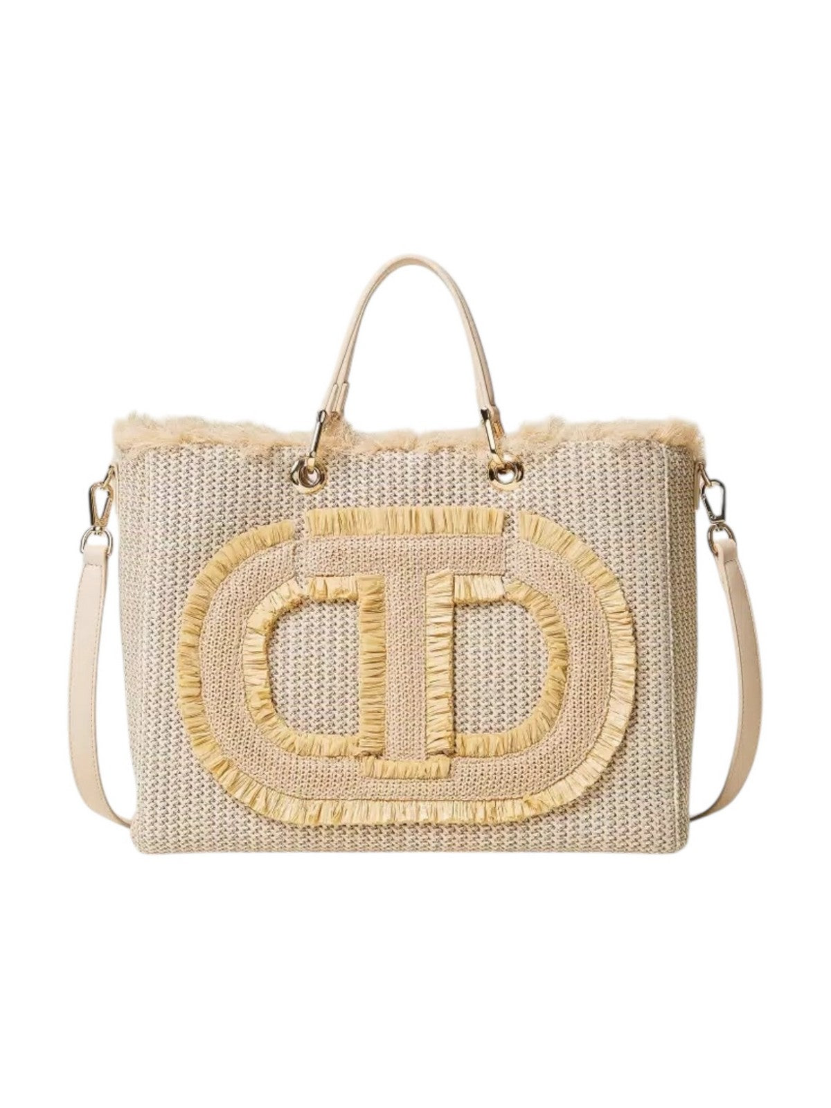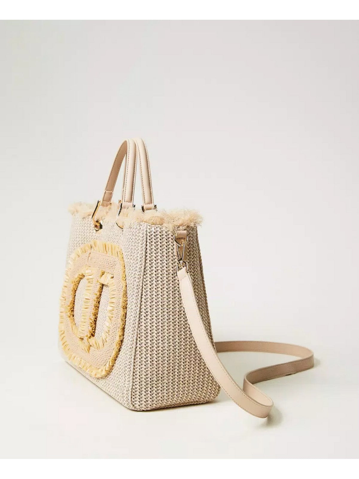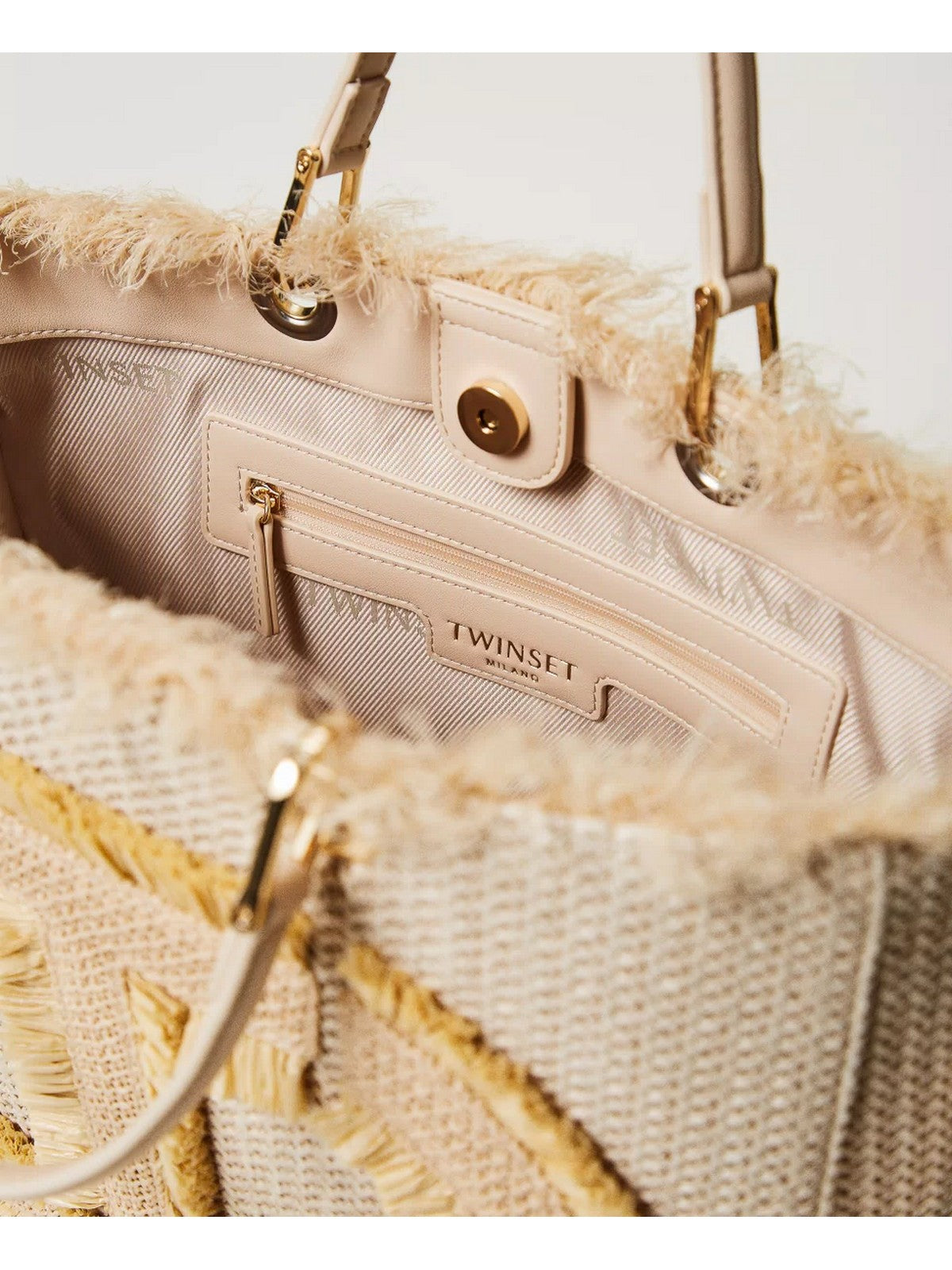 Borsa shopper TWINSET realizzata in diversi materiali effetto paglia naturale e rafia con logo Oval T patch sfrangiato