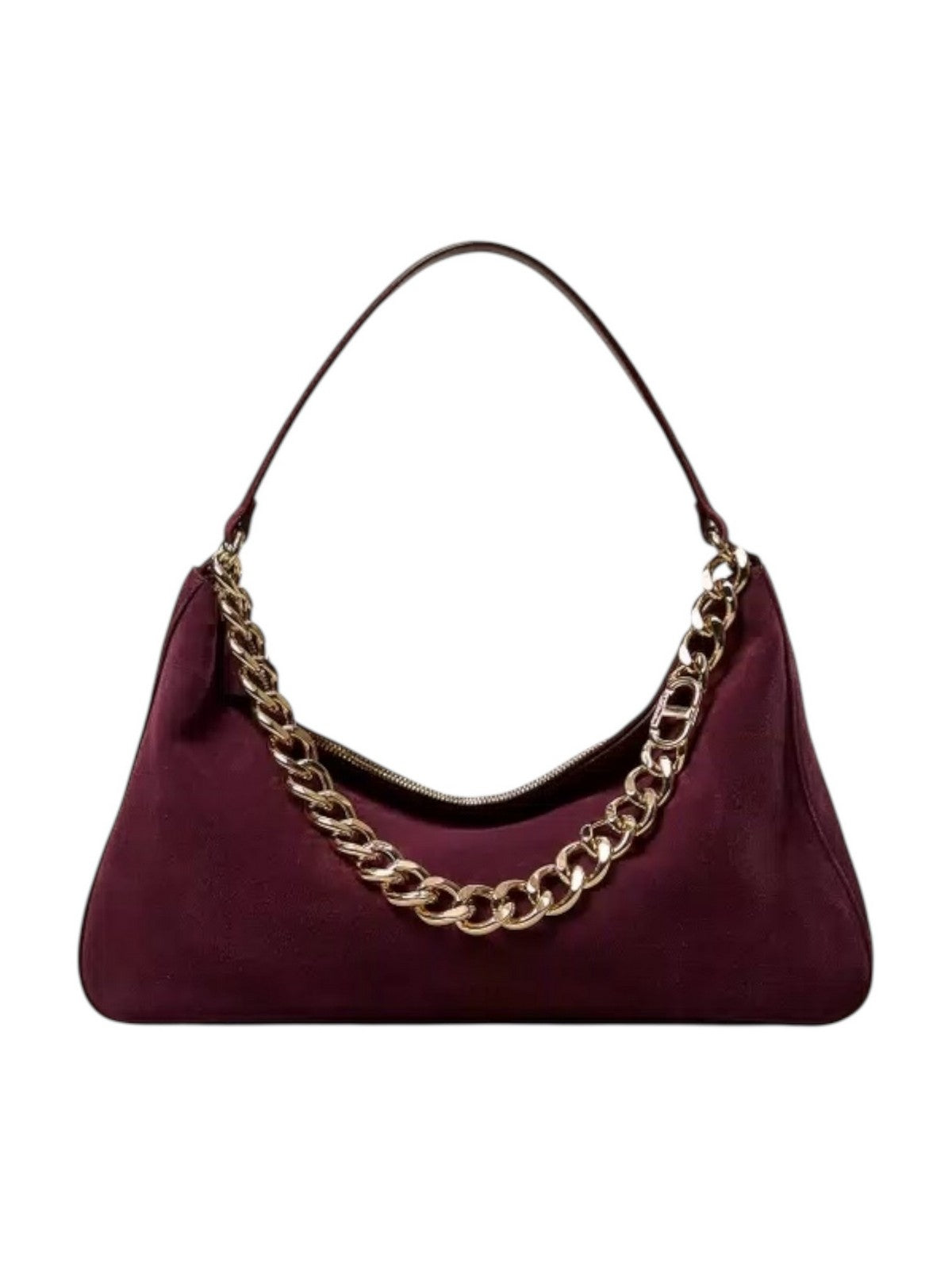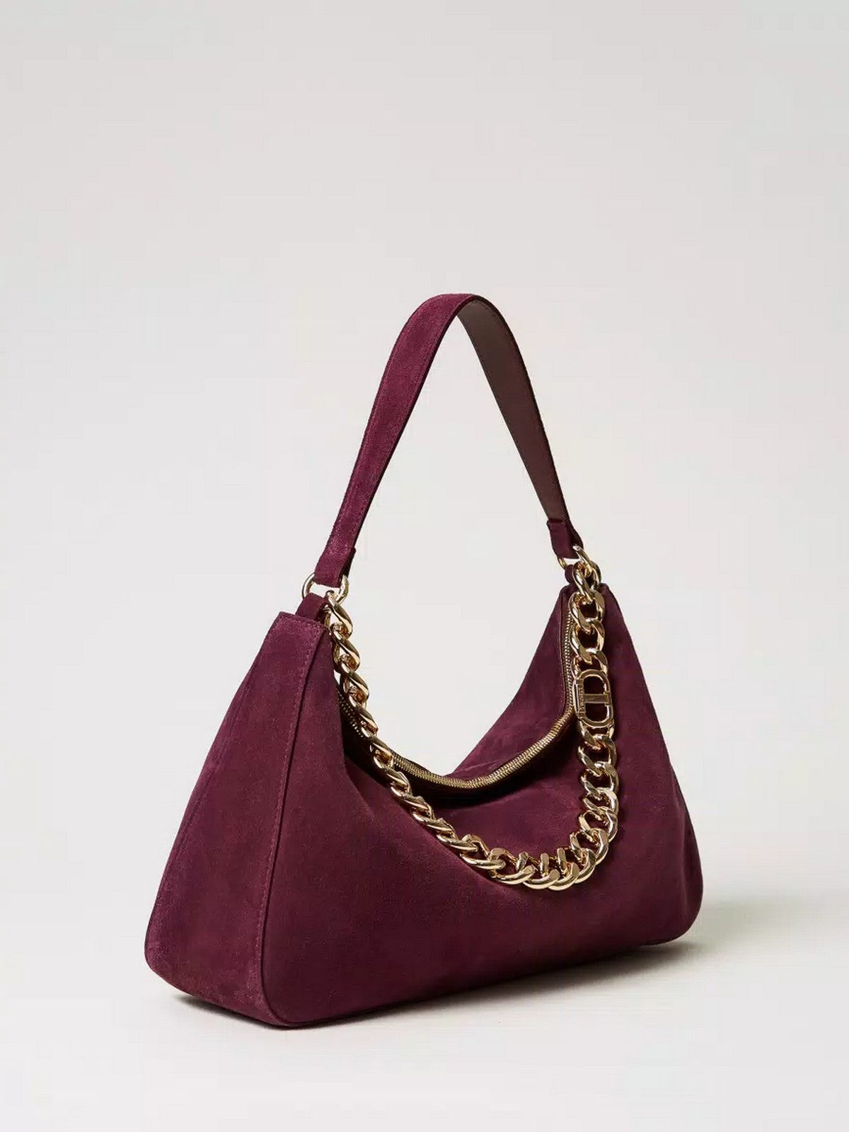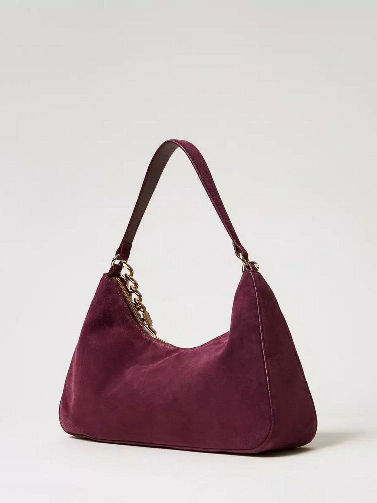 Borsa hobo 'Liliane' TWINSET realizzata in pelle scamosciata con trattamento anti stingimento. Il corpo è realizzato a colonna con un rinforzo in microfibra, con logo impresso a caldo, e foderato con un twill in misto cotone.