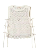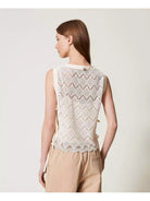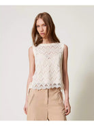 Top corto TWINSET in pizzo macramè con disegno geometrico e fianchi aperti con nastri da annodare.